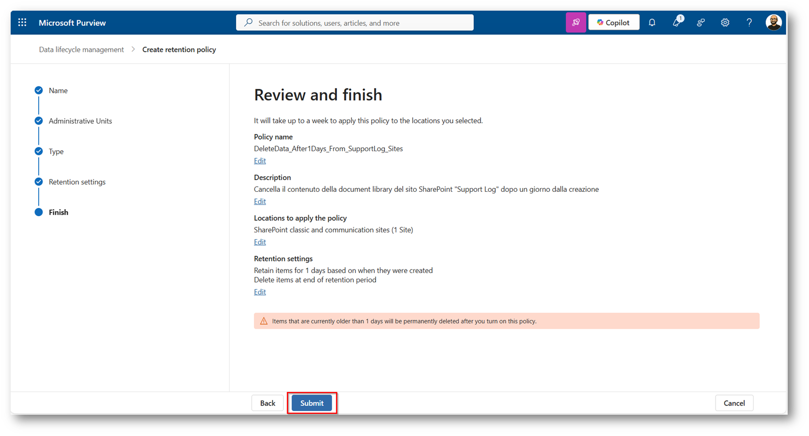 Per rispondere a questa esigenza nasce proprio Microsoft Purview Data LifeCycle Management che permette di rimuovere il contenuto di un sito di SharePoint in modo automatico.
