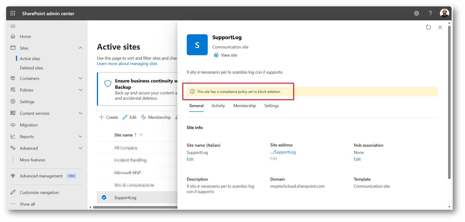 Figura 16: Sito oggetto della Policy segnalata che c’è applicata una Retention Policy
