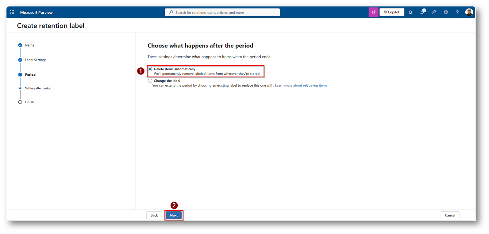- Applicazione automatica tramite la configurazione dei criteri di etichetta di conservazione.