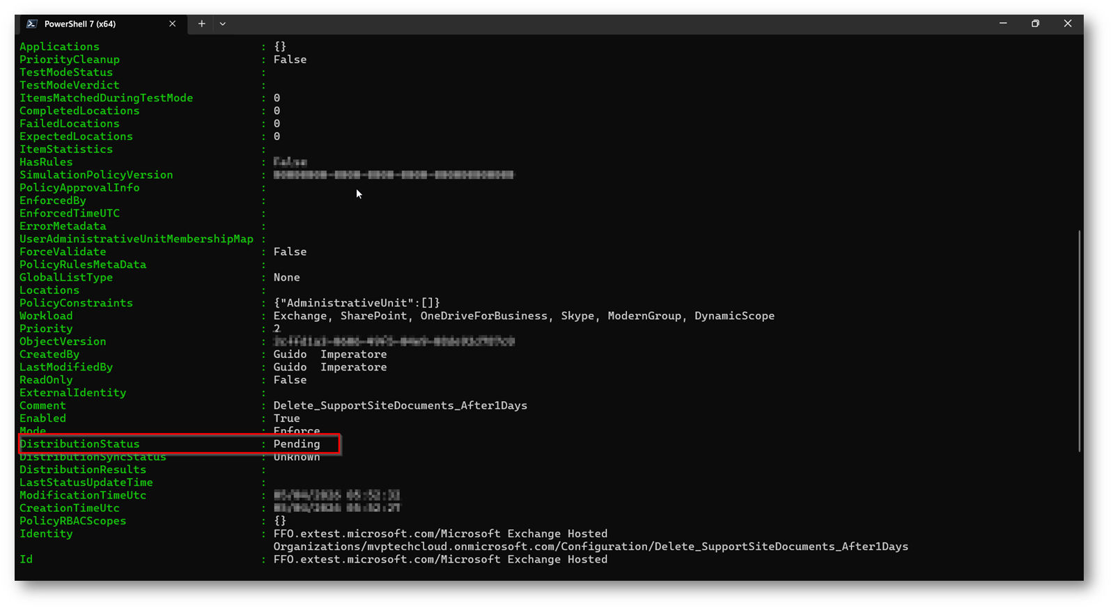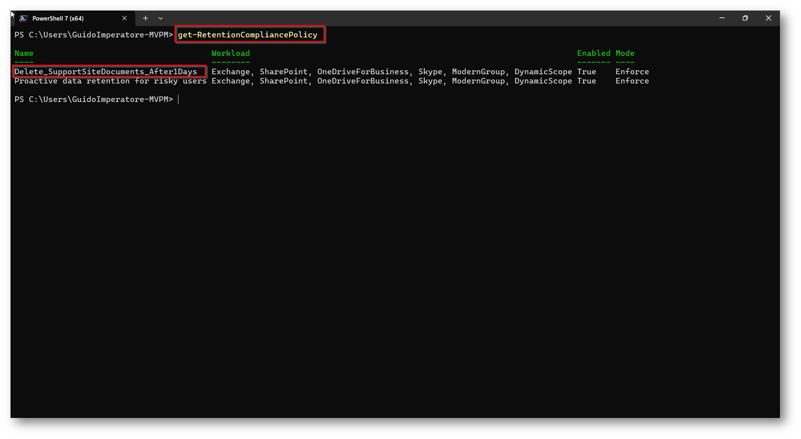 Per vedere il dettaglio della policy, nel mio caso “get-RetentionCompliancePolicy -Identity “Delete_SupportSiteDocuments_After1Days” | fl”