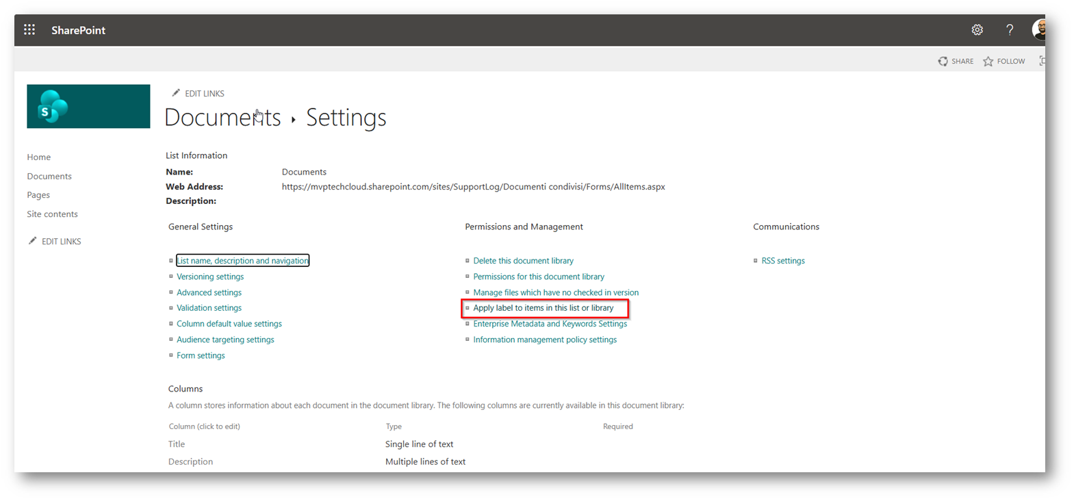 NB: con questo metodo la Retention Policy viene applicata all’intero sito di SharePoint e non solo alla documento Library quindi verrebbe cancellato tutto il sito, utile quando dovete eliminare non solo contenuto ma l’interno SharePoint Sites, nel mio caso specifico è necessario applicare il metodo che vedremo successivamente