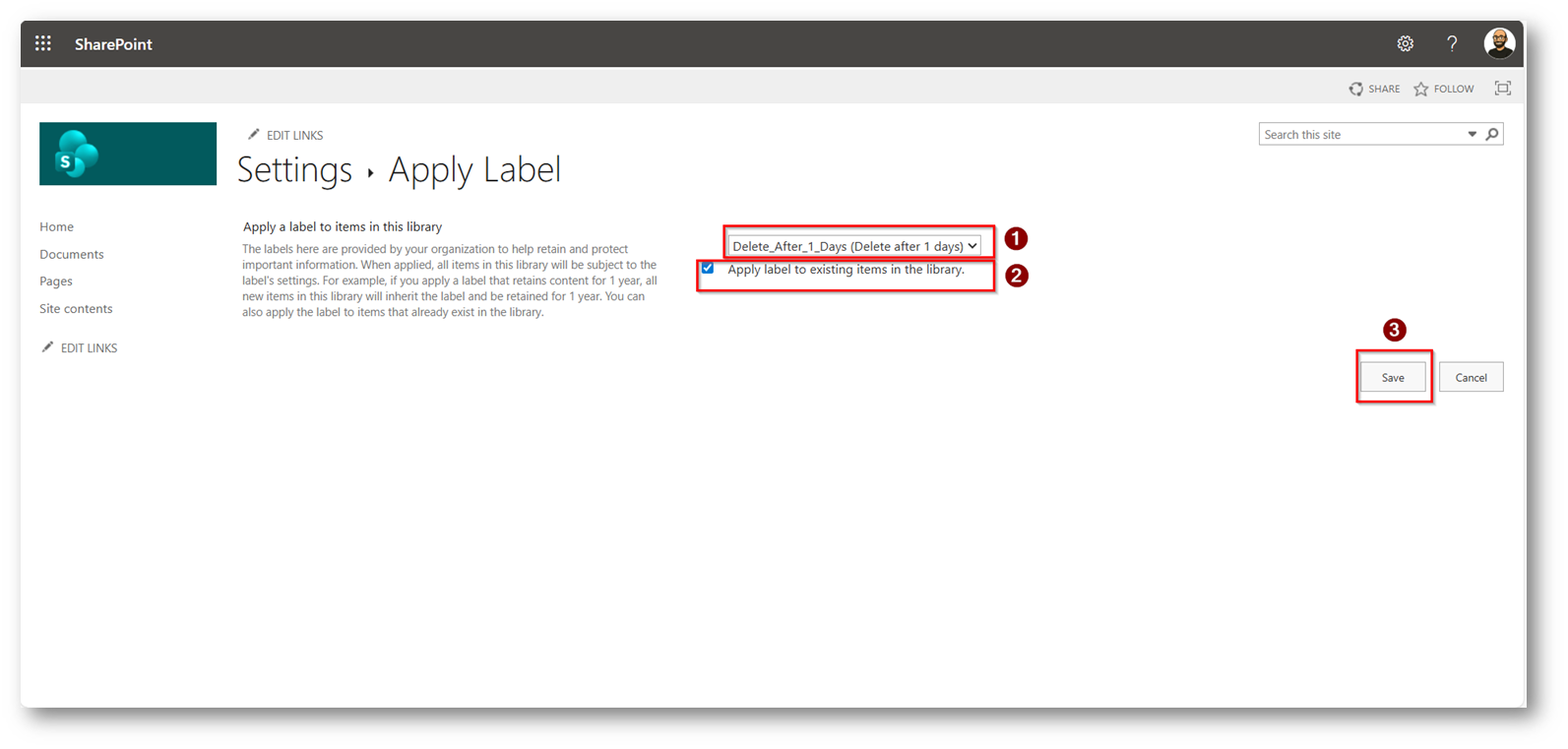 Figura 35: Impostazione che dovremmo modificare con la Retention Label creata in precedenza
