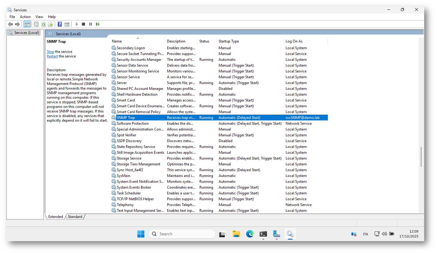 Nel nostro esempio pratico, effettueremo la migrazione dell’account di dominio legacy [email protected], attualmente configurato per eseguire il servizio SNMP Trap, verso un Delegated Managed Service Account (dMSA).