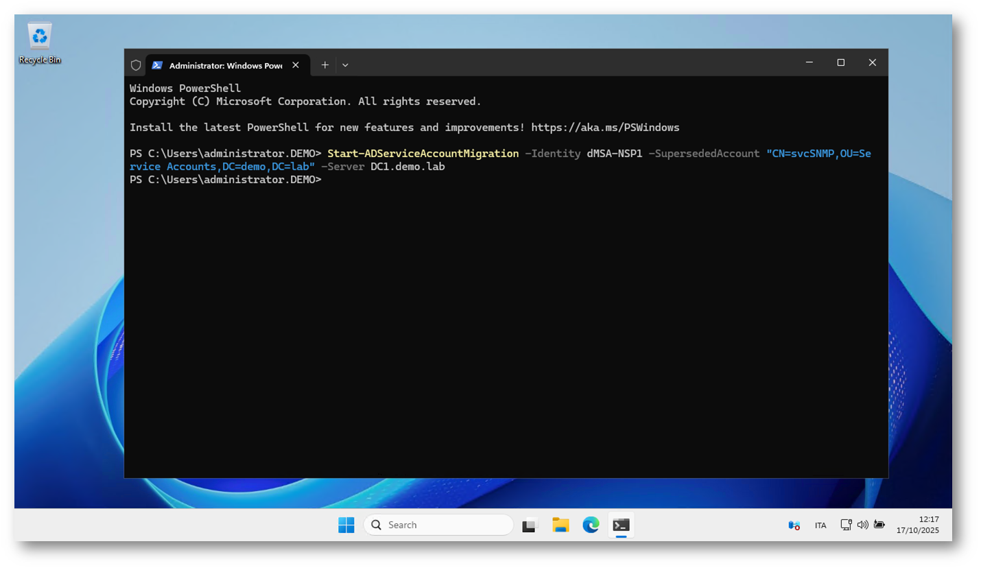 Figura 4: Avvio della migrazione dell’account legacy svcSNMP verso il nuovo dMSA dMSA-NSP1