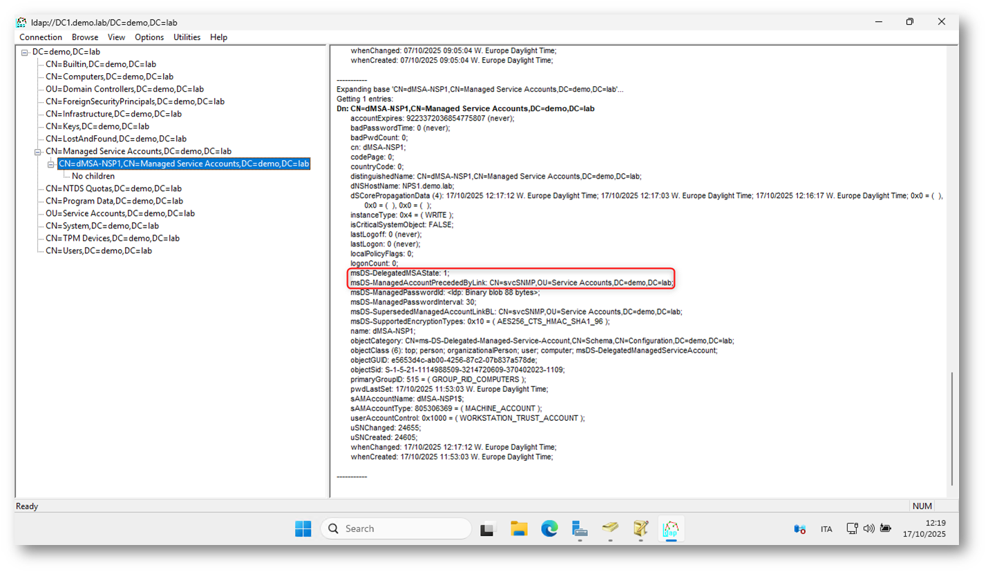 Figura 9: Completamento della migrazione del servizio SNMP verso il dMSA e stato aggiornato a msDS-DelegatedMSAState = 2