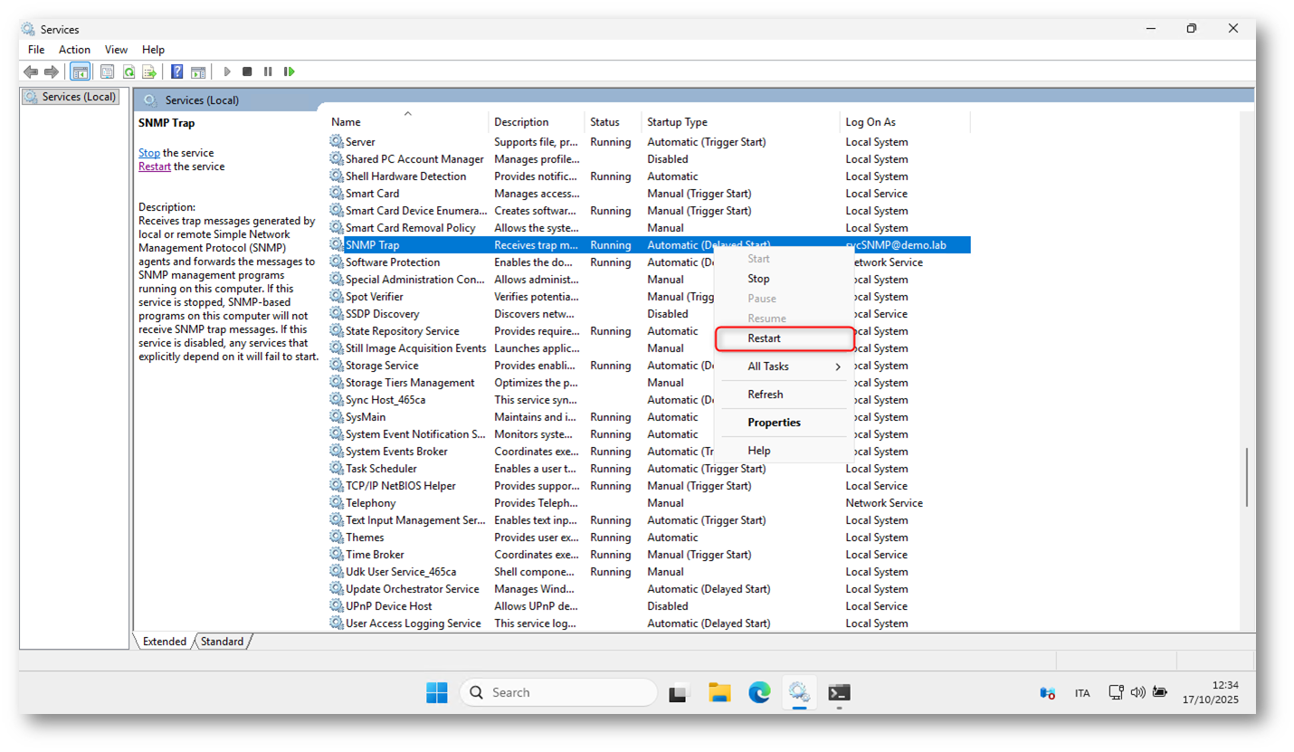 Figura 7: Riavvio del servizio SNMP Trap per aggiornare le informazioni sull’identità del dispositivo