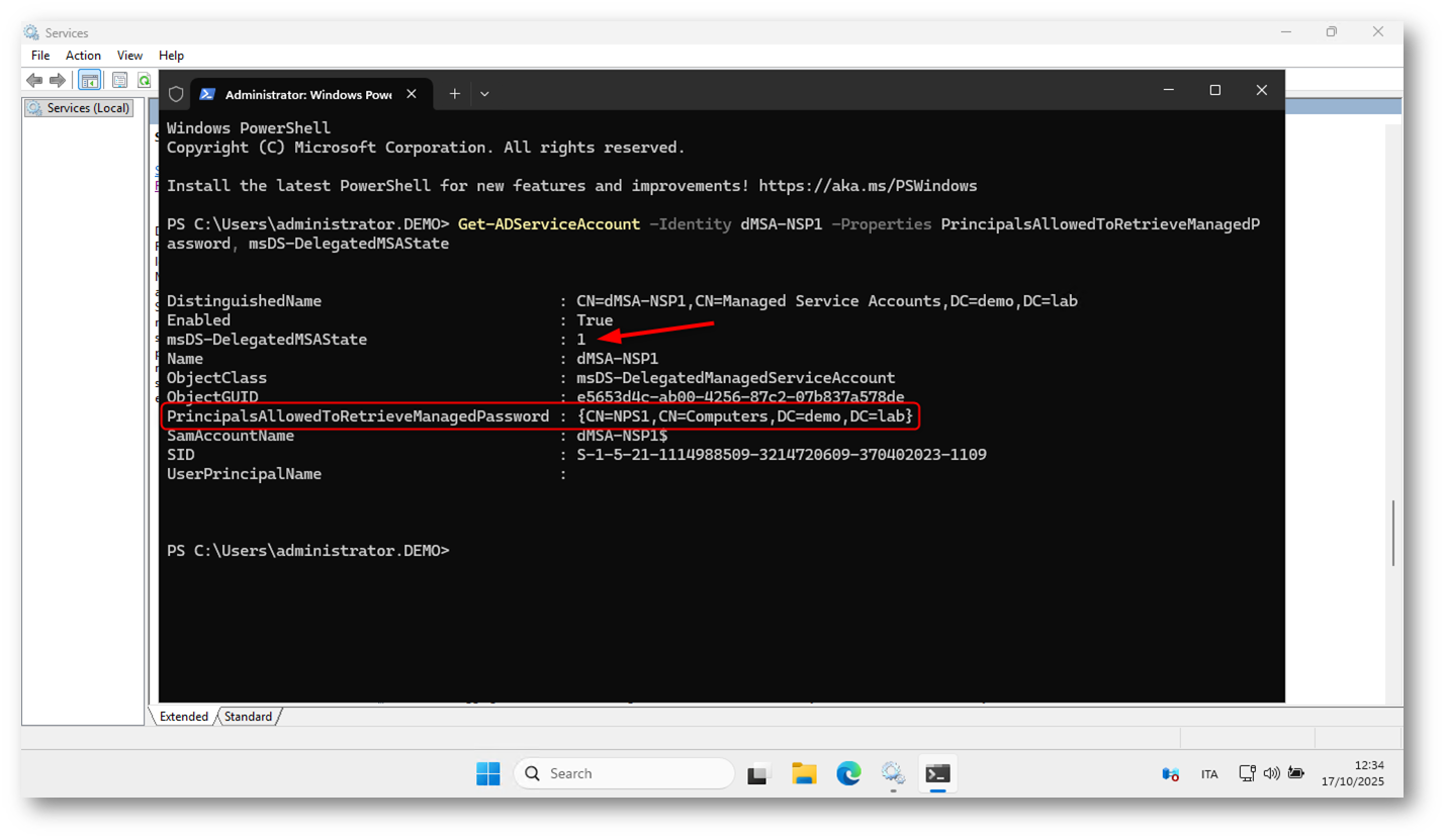 Per verificare che la migrazione e il binding del dMSA al server siano avvenuti correttamente, potete utilizzare la cmdlet Get-ADServiceAccount in PowerShell.