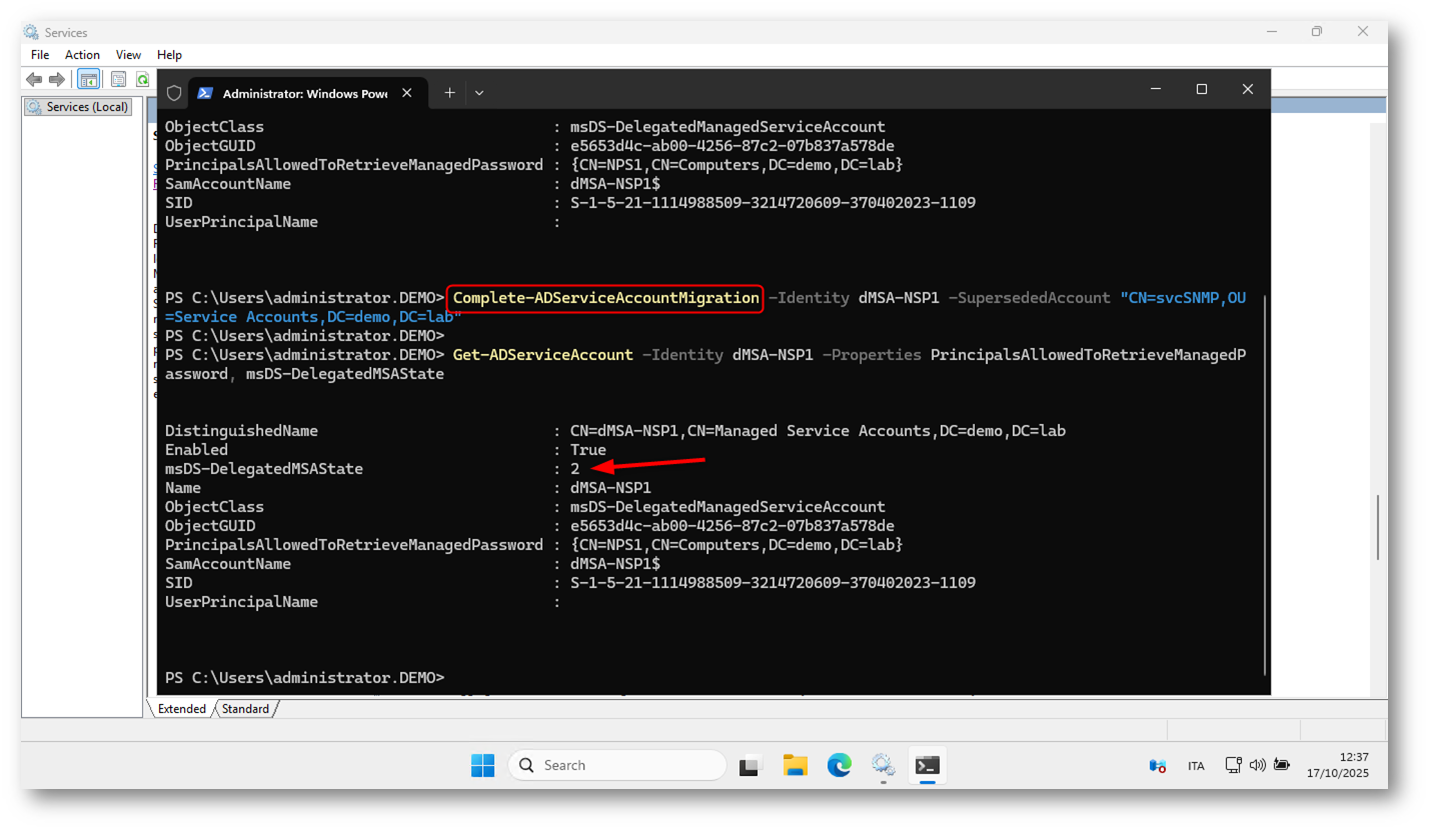 Una volta verificato che il nuovo Delegated Managed Service Account (dMSA) sia stato creato correttamente in Active Directory, possiamo procedere con la migrazione dell’account legacy utilizzato dal servizio.