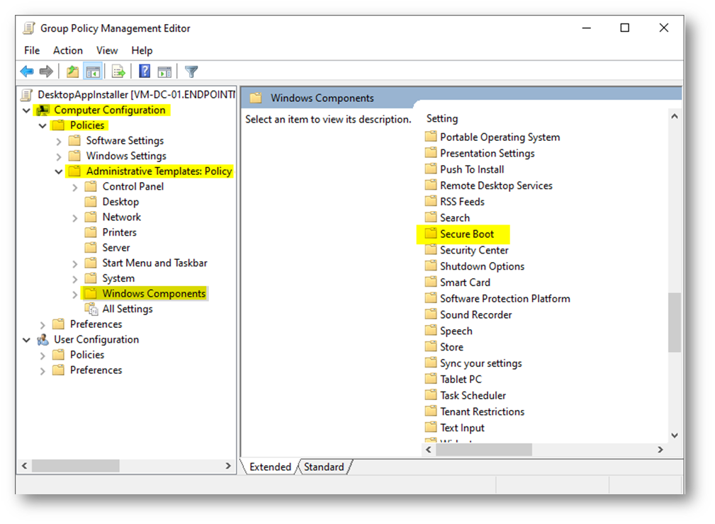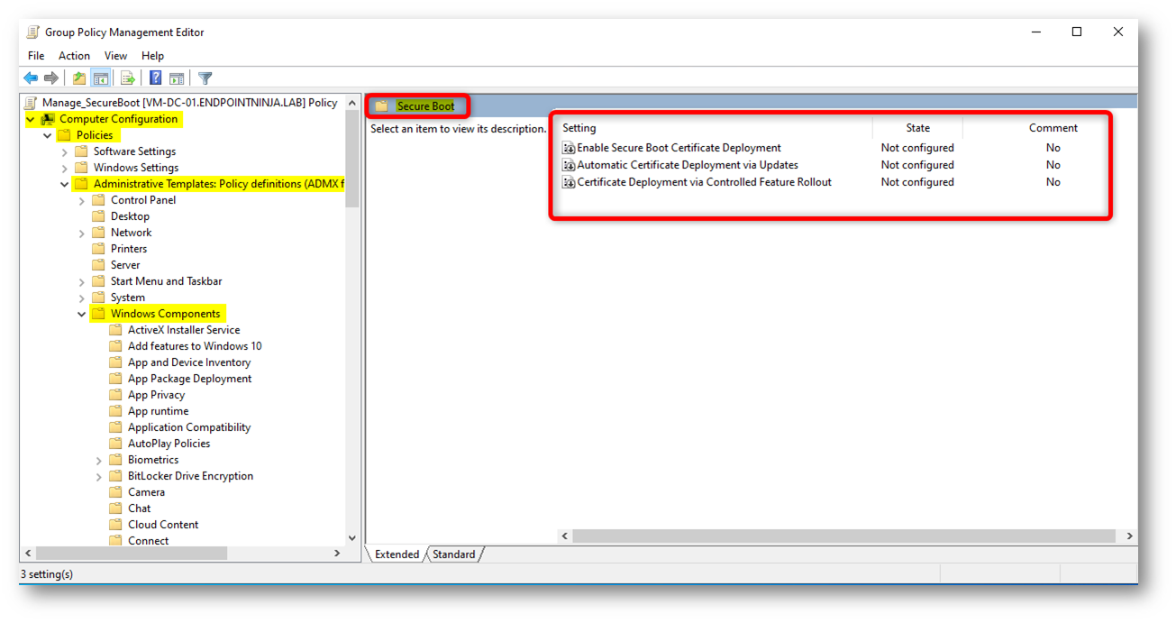 A copia completata, aprendo la Group Policy Management Console dovreste vedere le impostazioni sotto Computer Configuration > Administrative Templates > Windows Components > Secure Boot e poterle configurare