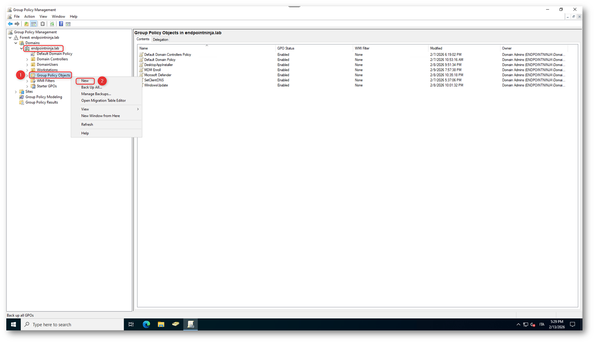 La nuova GPO comparirà nell’elenco sotto Group Policy Objects. A questo punto, facciamo clic con il tasto destro sulla GPO appena creata e selezioniamo Edit per aprire l’editor e configurare le impostazioni.