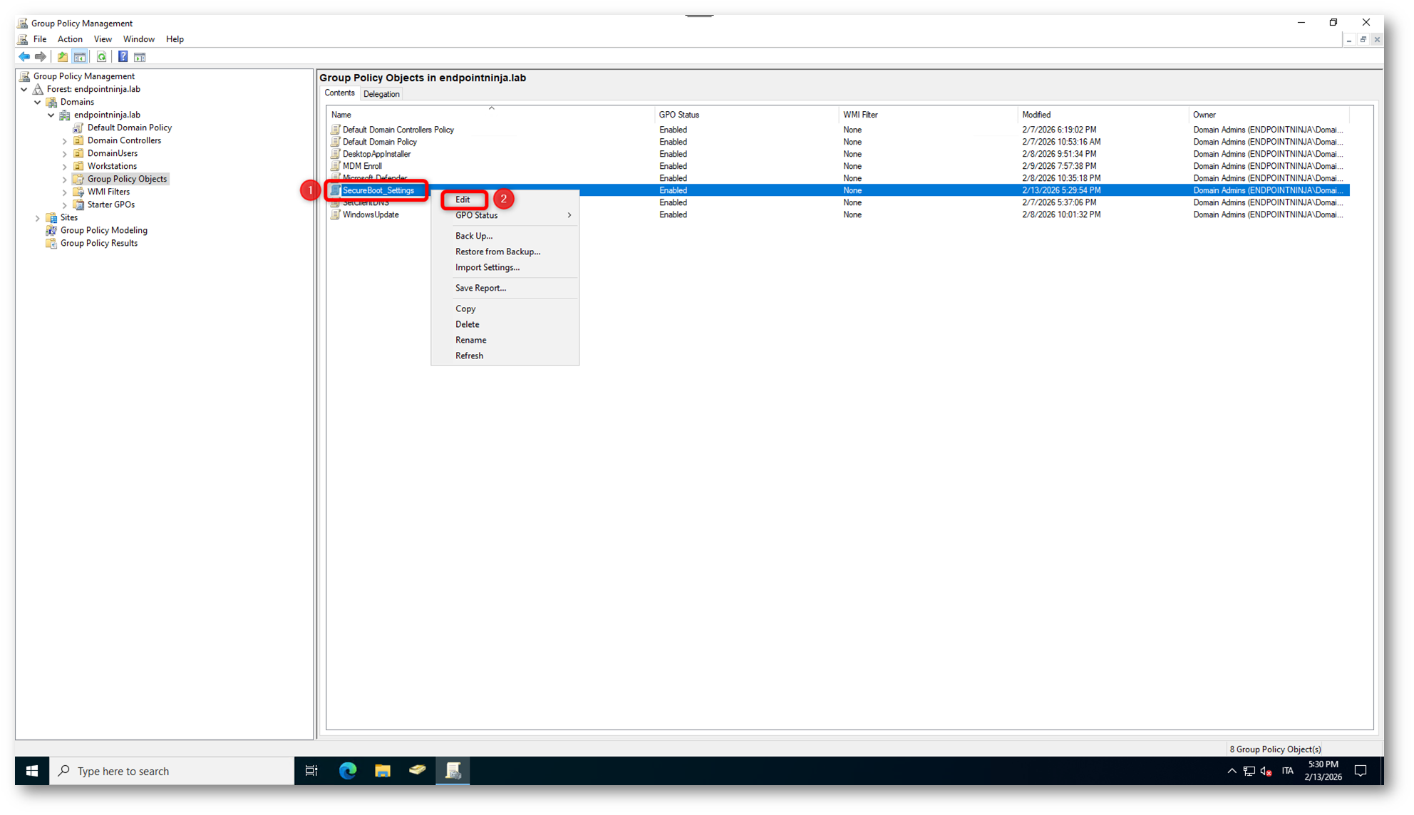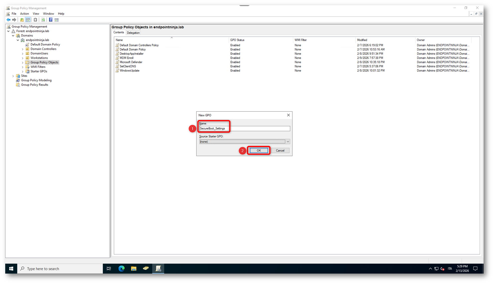 Figura 13: Creazione GPO per Secure Boot settings – Parte 1
