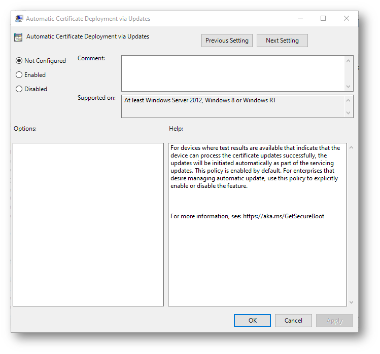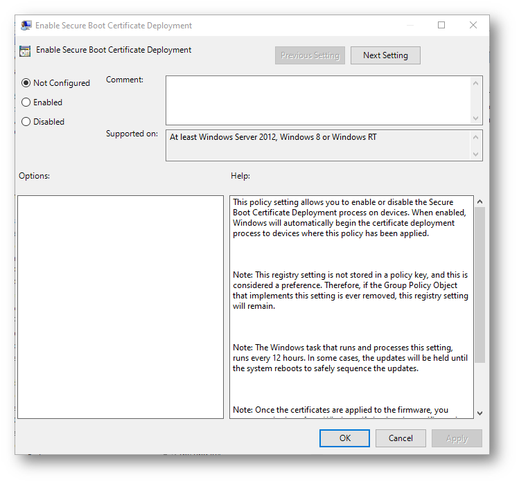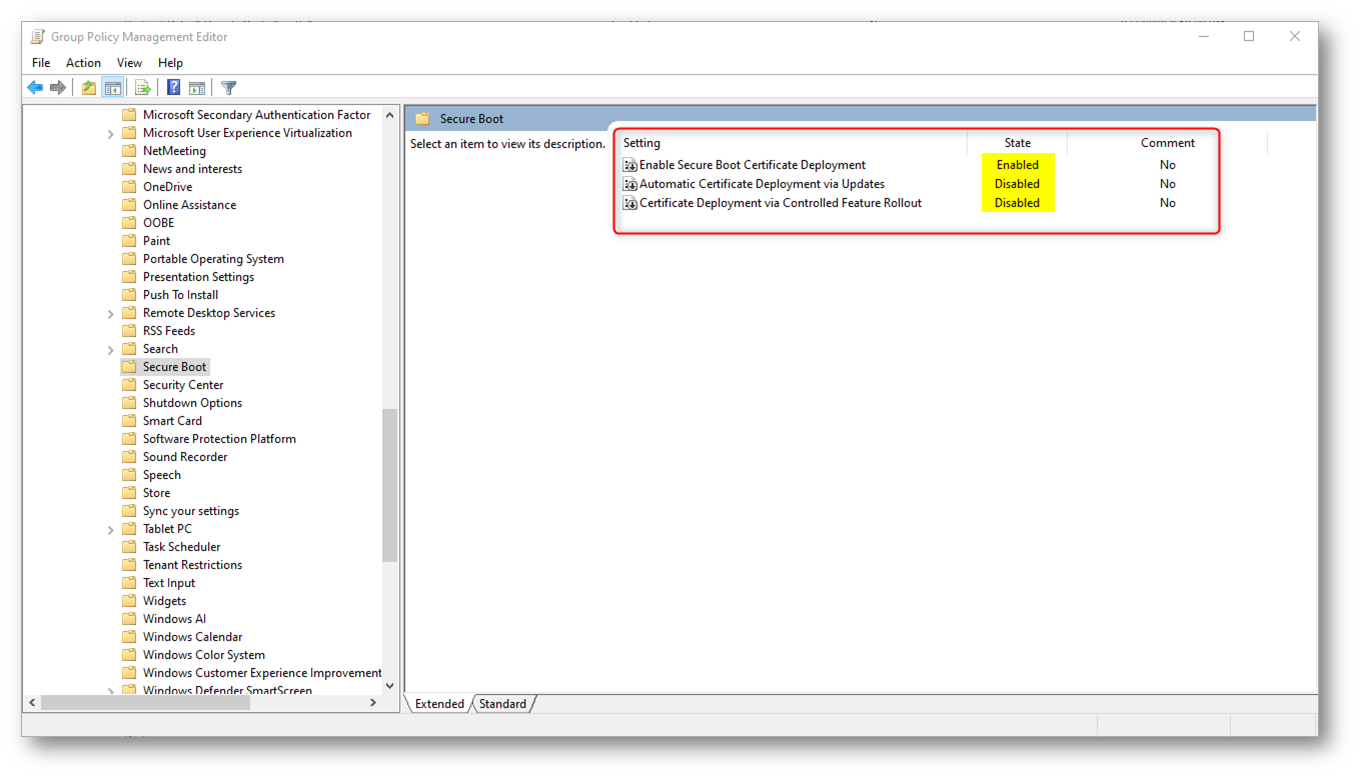 Sul piano Group Policy, Microsoft ha pubblicato le impostazioni dedicate sotto il percorso Computer Configuration > Administrative Templates > Windows Components > Secure Boot