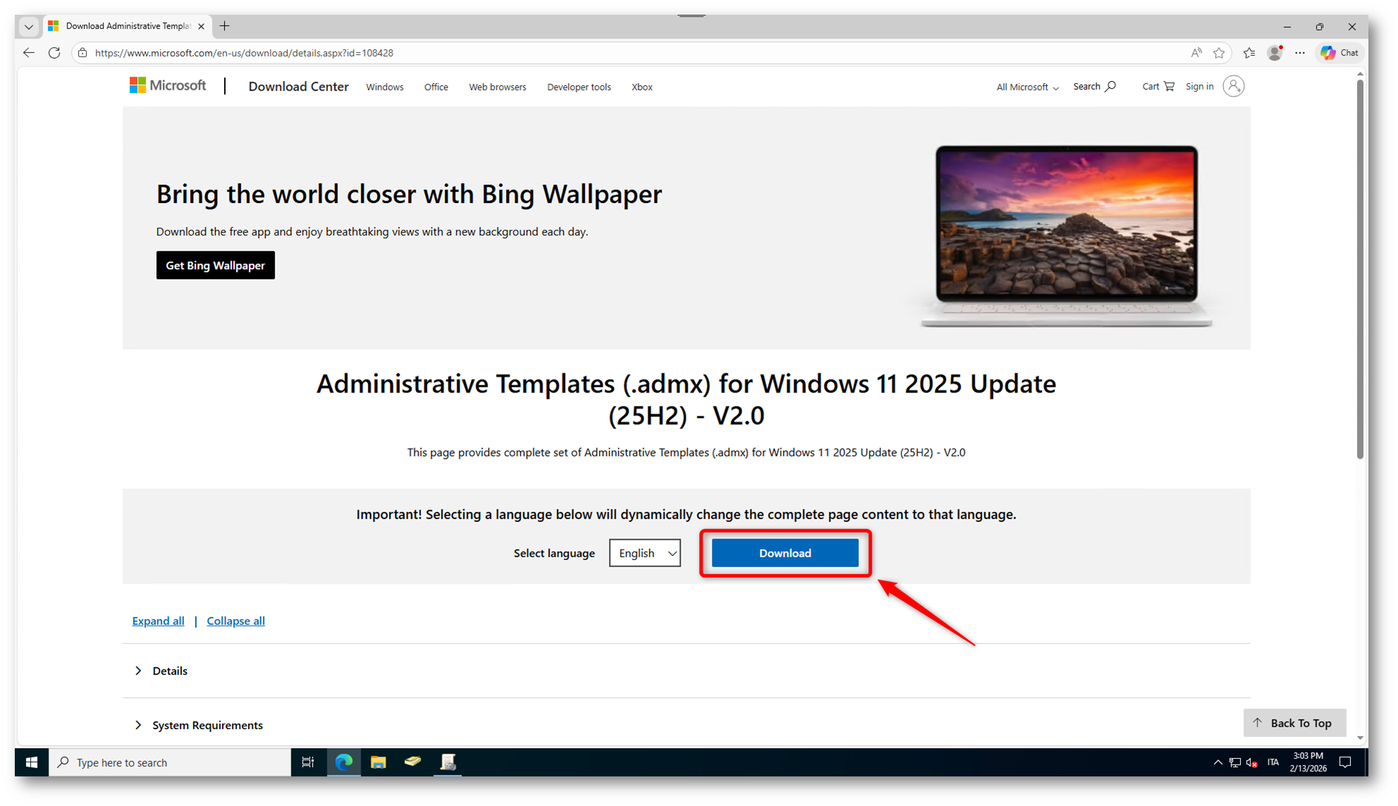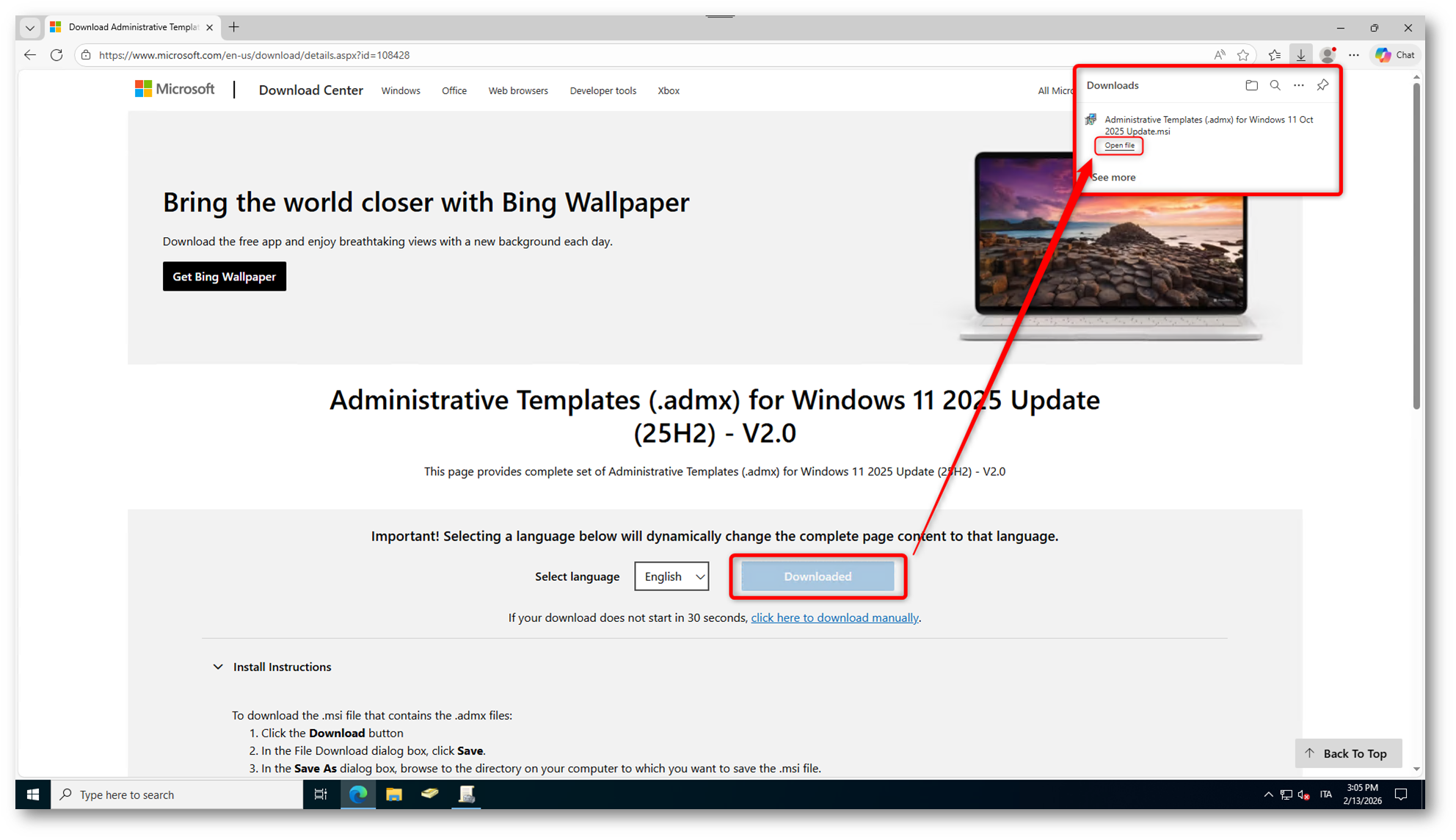 In questa demo vedremo come scaricare e installare gli Administrative Templates (ADMX/ADML) per la piattaforma Windows Client; la procedura è sostanzialmente identica anche per Windows Server, utilizzando il pacchetto dedicato indicato nella sezione Resources della guida Microsoft. Come prima cosa, apriamo la pagina Download Administrative Templates (.admx) for Windows 11 2025 Update (25H2) – V2.0 e avviamo il download del pacchetto MSI tramite il pulsante Download