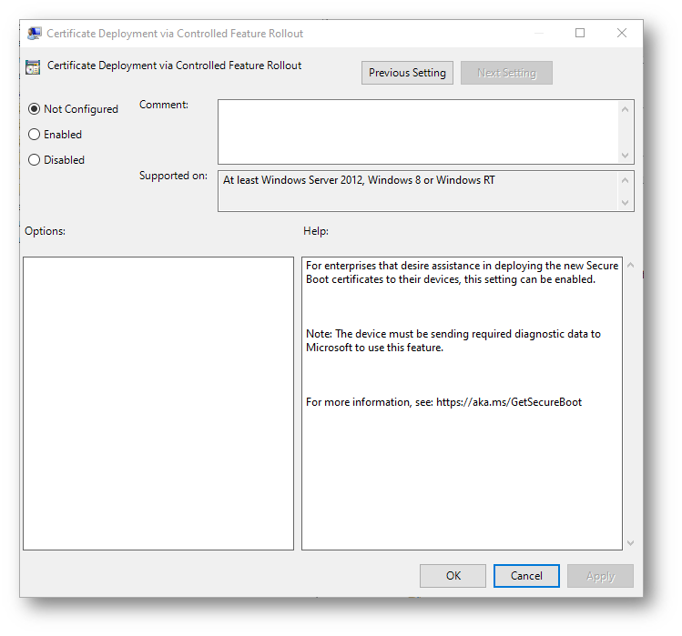 Un ultimo prerequisito, spesso sottovalutato, è che l’aggiornamento dei certificati Secure Boot non è solo Windows ma dipende anche dal firmware, e vi raccomando dunque un rollout prudente. Alcuni dispositivi potrebbero anche aver bisogno di un aggiornamento del firmware prima di poter riuscire ad aggiornare i certificati Secure Boot.