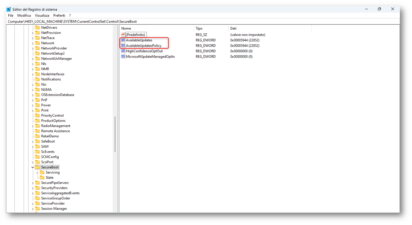 Sul piano Windows, Microsoft ha introdotto i registry keys (tra cui AvailableUpdates, UEFICA2023Status, UEFICA2023Error e le chiavi legate agli “assist” di rollout tramite Windows Update o Controlled Feature Rollout) all’interno di aggiornamenti rilasciati a partire dal 14 ottobre 2025 per le versioni supportate (Windows 10 22H2 e successive, Windows 11 supportate, Windows Server 2022 e successive), con ulteriori estensioni dall’11 novembre 2025 per versioni ancora in supporto. Questo è il prerequisito tecnico che rende realmente eseguibile il rollout, indipendentemente dal fatto che tu lo attivi via GPO o con altri strumenti.