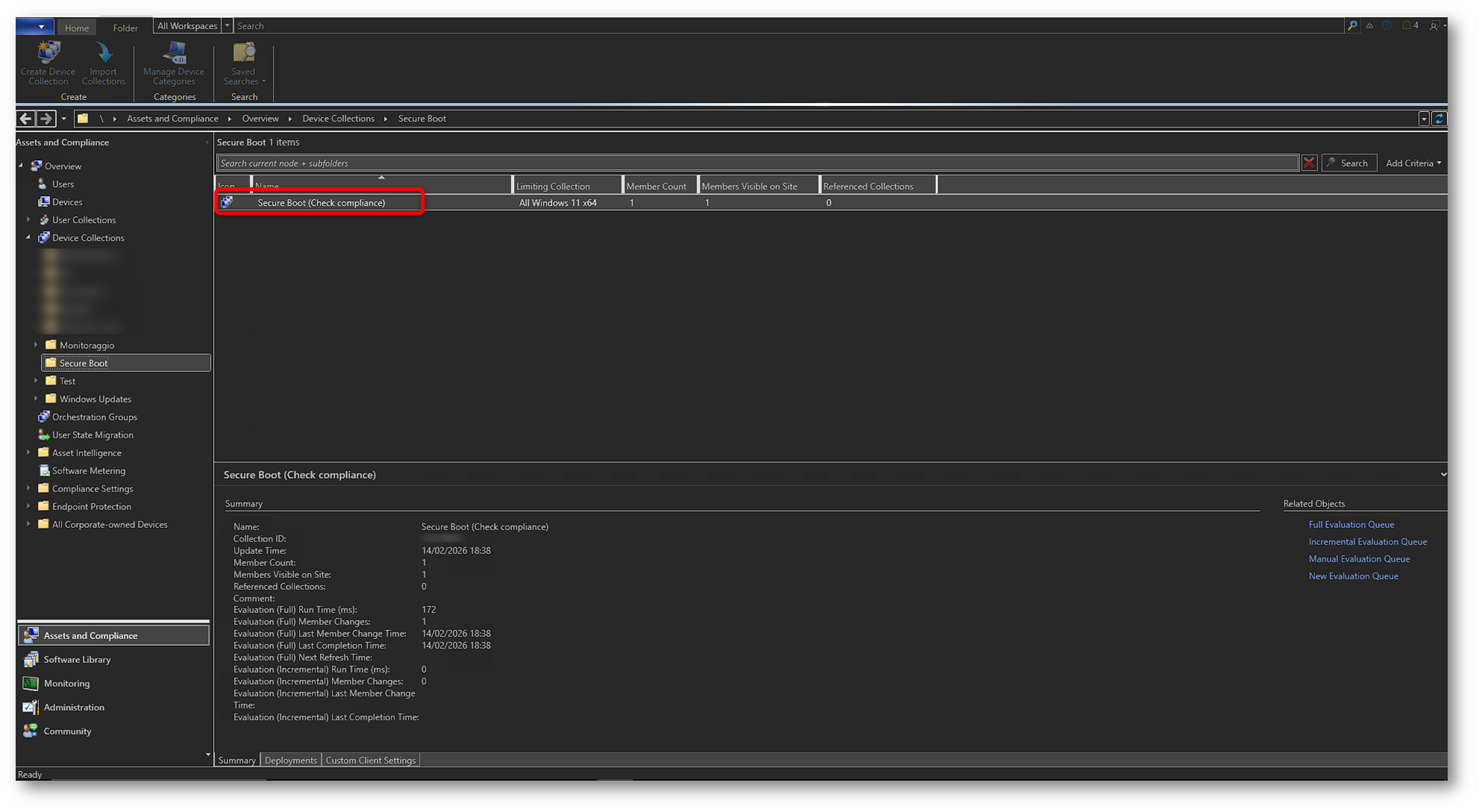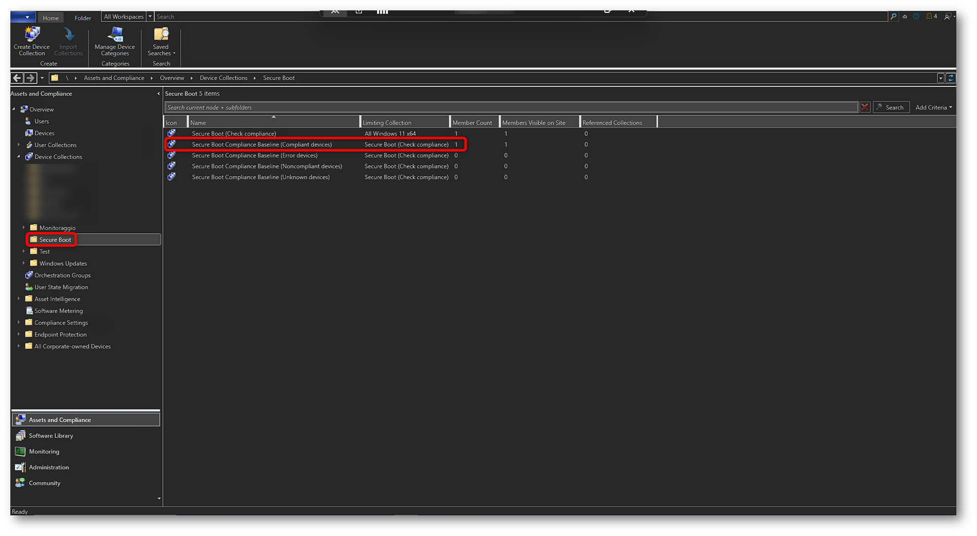 A questo punto spostiamoci sulla console di SCCM. Nella device collection di monitoraggio creata in precedenza “Secure Boot Compliance Baseline (Compliant devices)“, possiamo verificare che la collection si sia popolata correttamente. In particolare, la colonna Member Count riporta 1 dispositivo: è il nostro pc pilota, che risulta quindi incluso tra i membri. Questo conferma che lo stato di compliance restituito dal Configuration Item sta alimentando correttamente la membership della collection in modo dinamico, come previsto.