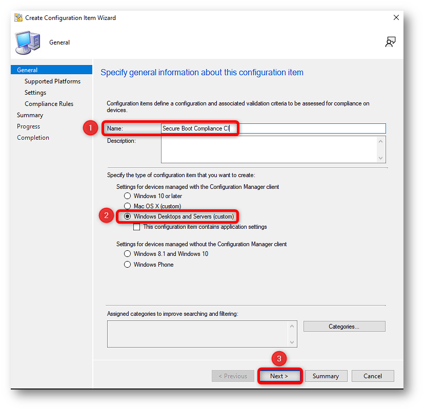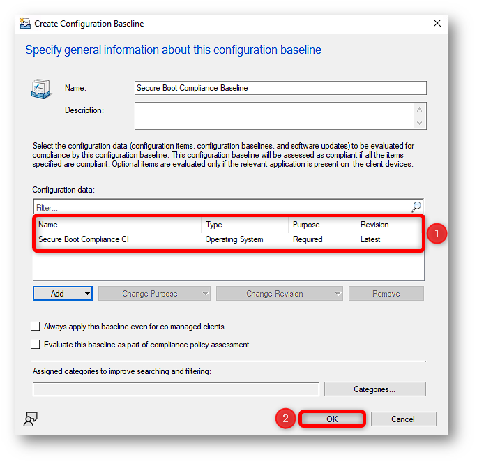Nel wizard che si apre, assegniamo un nome alla baseline (ad esempio “Secure Boot Compliance Baseline“) e, se lo ritenete utile, aggiungiamo una descrizione per contestualizzare l’obiettivo. Proseguiamo quindi con Add > Configuration Items per includere nella baseline il Configuration Item creato nel capitolo precedente