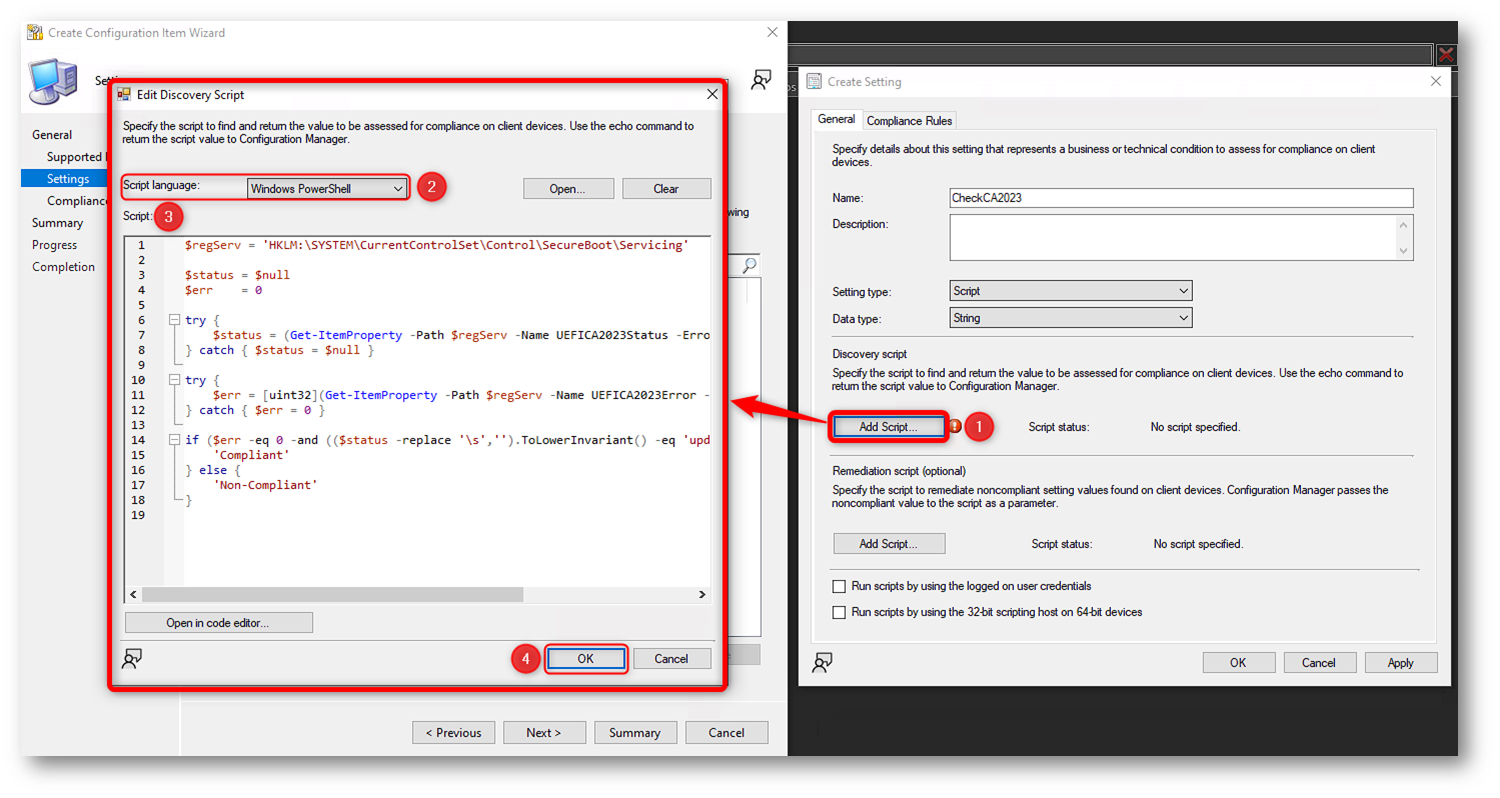 Per lo scopo di questa guida, lo script è volutamente semplice ma rigoroso. Ci restituirà Compliant solo quando UEFICA2023Status è Updated e UEFICA2023Error è 0. In scenari reali potreste essere tentati di aggiungere logiche alternative (ad esempio se il DB contiene Windows UEFI CA 2023 ma lo status non è valorizzato). Il mio suggerimento, però, è mantenere una regola rigorosa. Finché entrambi gli indicatori non risultano in linea, la compliance deve restare Non-Compliant, così la reportistica e le collection SCCM rimangono pulite e non producono falsi positivi.