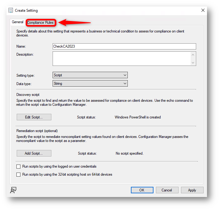 Nota: se volete che il dispositivo risulti Non-Compliant anche nel caso in cui lo script non trovi l’istanza del setting (ad esempio chiavi mancanti), potete selezionare l’opzione “Report noncompliance if setting instance is not found”. In questa specifica verifica è una scelta sensata, perché l’assenza delle chiavi può indicare prerequisiti non presenti o device fuori scope.