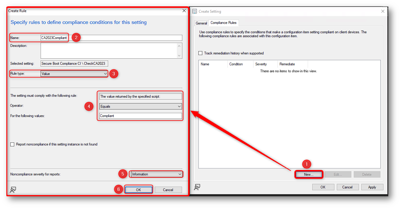 A questo punto spostiamoci nella scheda Compliance Rules per definire la regola associata al setting appena creato.