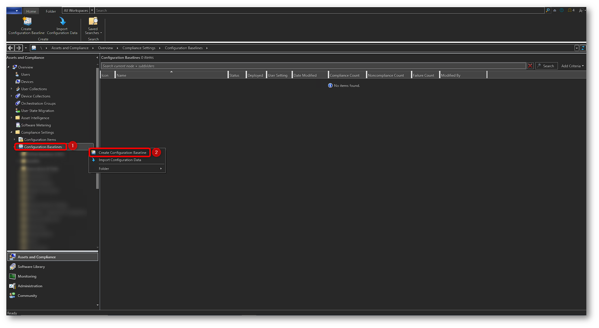 Spostiamoci ora nella sezione Compliance Settings > Configuration Baselines. Qui facciamo clic con il tasto destro e selezioniamo Create Configuration Baseline.