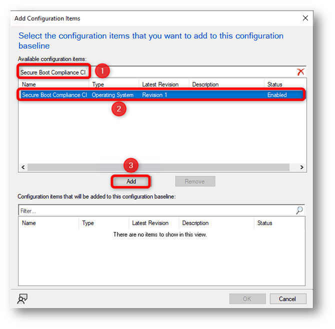 Nel wizard Add Configuration Items che si apre, utilizziamo la barra di ricerca per individuare il Configuration Item creato in precedenza (nel nostro esempio “Secure Boot Compliance CI“). Selezioniamolo dall’elenco e facciamo click su Add.
