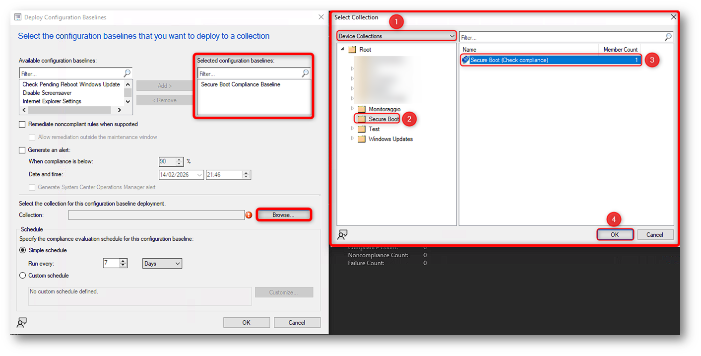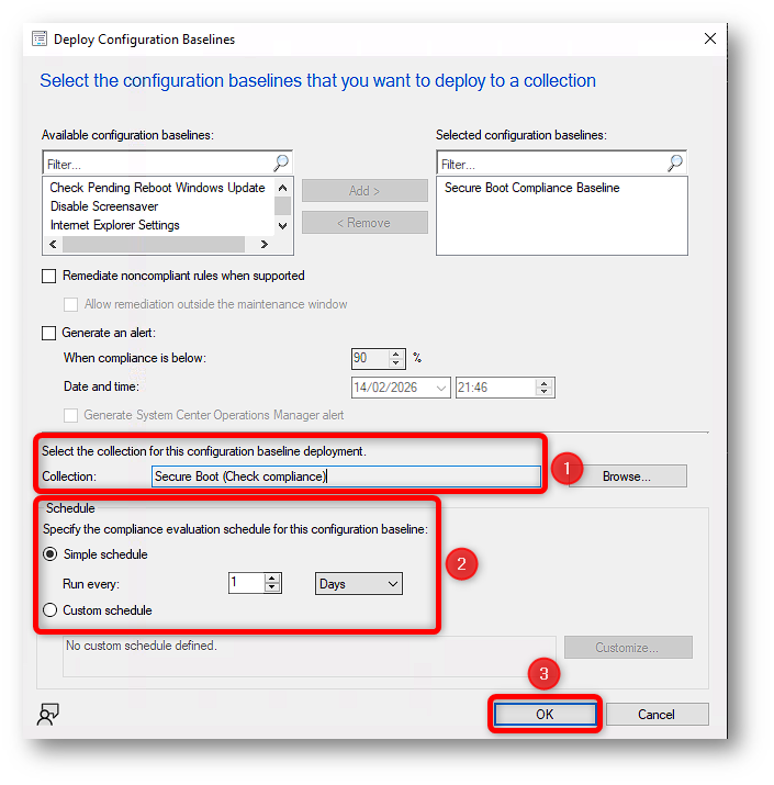 A questo punto configuriamo la Schedule di valutazione. Questa pianificazione stabilisce ogni quanto spesso il client SCCM riesegue il discovery script del Configuration Item e aggiorna lo stato di compliance della Baseline. In un’attività critica come questa per l’aggiornamento dei certificati Secure Boot con possibili step intermedi e reboot necessari, è consigliabile una valutazione almeno giornaliera, così da avere un monitoraggio regolare senza introdurre carico inutile sui client. Selezioniamo quindi Simple schedule con frequenza Every 1 days oppure, se preferite un controllo più ravvicinato durante il pilot, potete impostare una schedule personalizzata (ad esempio ogni 12 ore) e poi ridurla quando il rollout entra in fase stabile. Completata la configurazione, facciamo clic su OK per avviare il deploy.