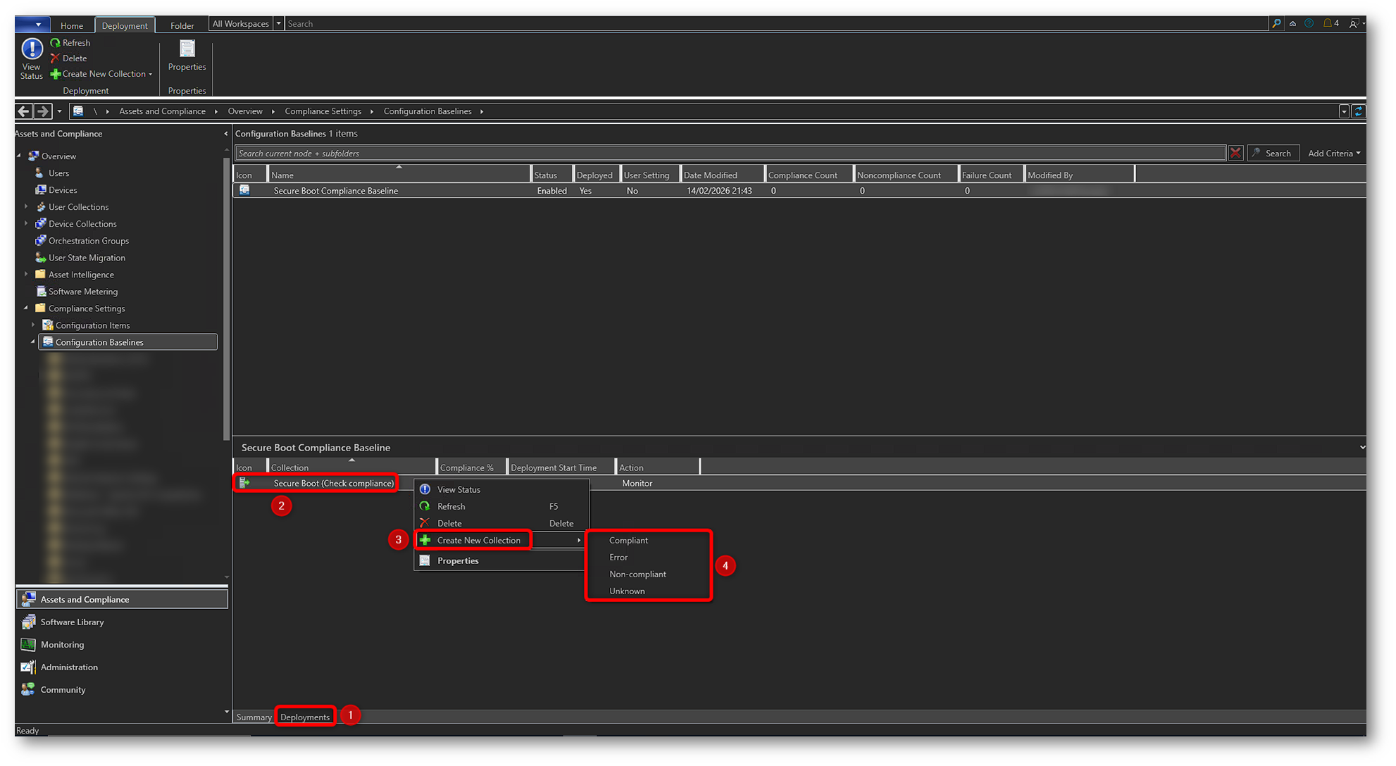Ora che la Configuration Baseline è stata distribuita, possiamo creare delle Device Collection dinamiche basate sullo stato di compliance della baseline. È un passaggio molto utile perché trasforma il monitoraggio in qualcosa di operativo: invece di guardare un report, ti ritrovi quattro gruppi di dispositivi sempre aggiornati, pronti per analisi e remediation. Per iniziare, selezioniamo la nostra Baseline in Compliance Settings > Configuration Baselines. Nella parte bassa della console spostiamoci nella tab Deployments, individuiamo il deployment appena creato; quindi, facciamo clic con il tasto destro e selezioniamo Create New Collection.