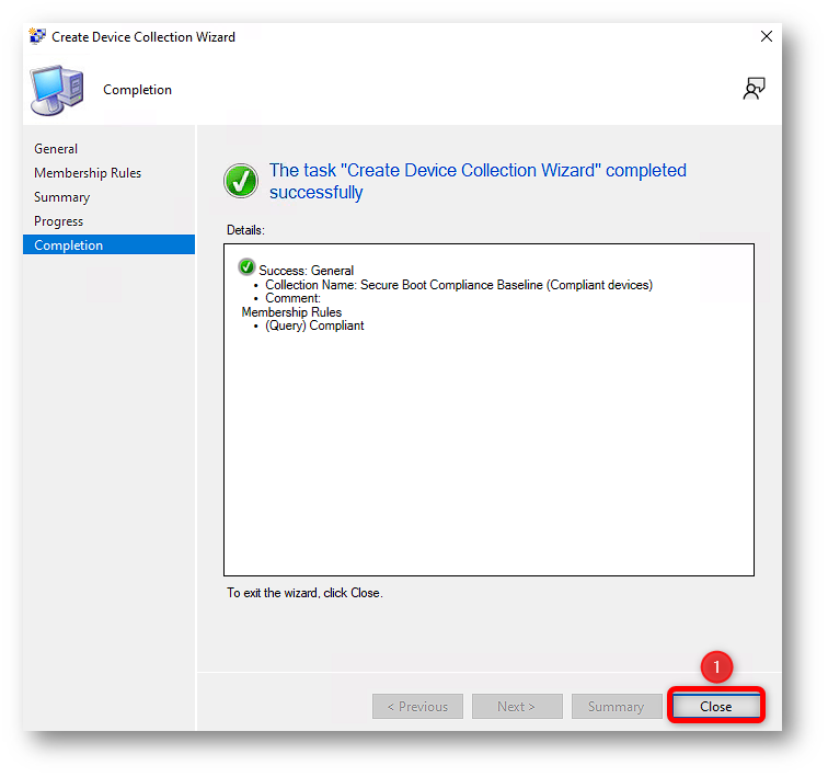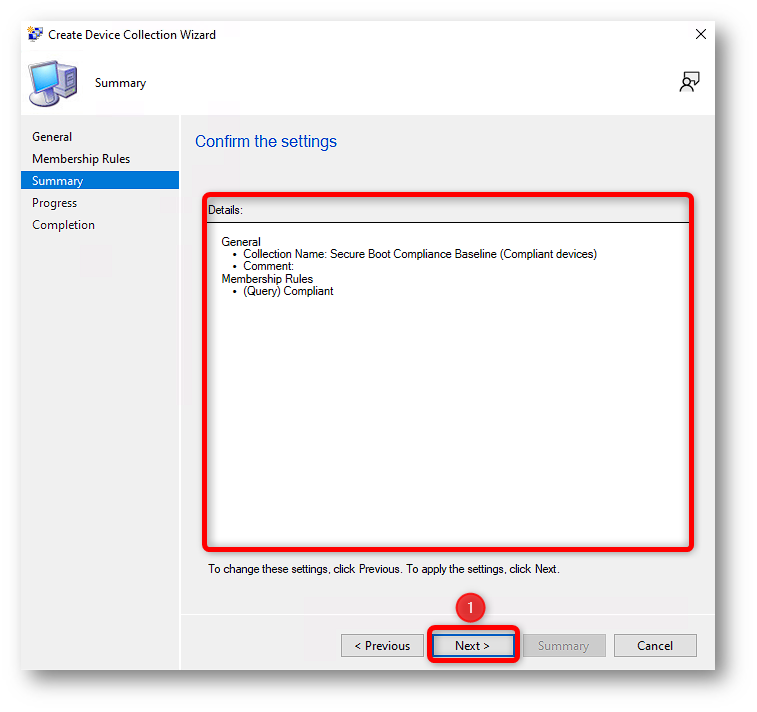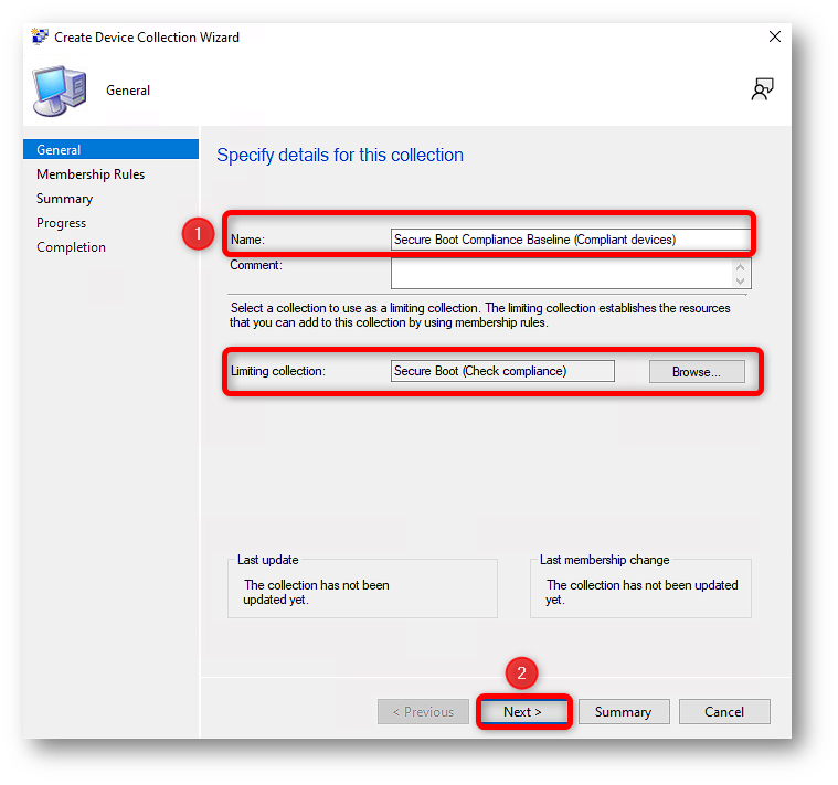 Nel wizard che si apre troverete un nome preimpostato. Sostituiamolo con un naming in linea con l’obiettivo, ad esempio “Secure Boot Compliance Baseline (Compliant devices)“. Come potete notare, la collection che stiamo creando eredita già come ambito di riferimento la device collection pilota utilizzata per il deploy della baseline. In questo modo il monitoraggio resta allineato alla wave selezionata. Proseguiamo con Next.