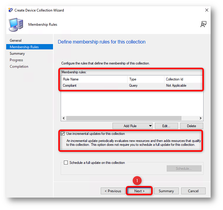 Nella schermata successiva, anche la Membership rule è già precompilata. SCCM genera automaticamente una query che popola la collection in base allo stato di compliance della baseline (in questo caso Compliant) e rispetto alla collection di partenza. Non è necessario modificarla, è proprio ciò che vogliamo ottenere per costruire collection dinamiche affidabili. Qui vi suggerisco di abilitare Use incremental updates for this collection. Il motivo è che durante un rollout, lo stato dei dispositivi cambia progressivamente (da Unknown a Non-Compliant, fino a Compliant). L’incremental update permette alla collection di aggiornarsi più rapidamente tra un ciclo e l’altro, evitando di dover attendere il full evaluation e rendendo il monitoraggio molto più reattivo, soprattutto nella fase di pilot e nelle prime wave. Proseguiamo con Next.