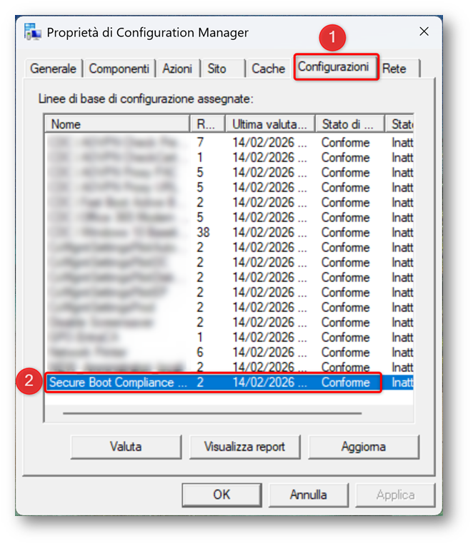 Chiudiamo il cerchio con due verifiche rapide, una lato client e una lato console SCCM, così da confermare che la Baseline è stata ricevuta, valutata e che lo stato di compliance sta alimentando correttamente le collection dinamiche. Sul client pilota, apriamo il pannello Configuration Manager (potete richiamarlo eseguendo smscfgrc.cpl oppure da Pannello di controllo > Sistema e sicurezza > Configuration Manager). Andiamo nella scheda Configurazioni, sezione relativa alle configuration baselines. Come mostrato nell’immagine seguente, il dispositivo ha già ricevuto la Configuration Baseline e risulta Compliant.