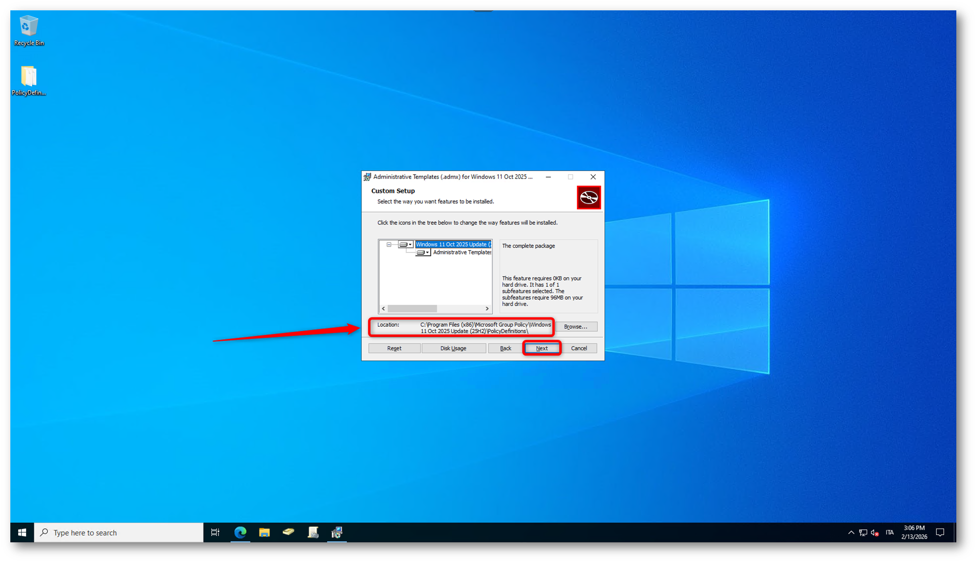 Nella schermata di setup, prendiamo nota del percorso in cui verranno estratti i file ADMX/ADML (oppure modifichiamolo tramite Browse, se necessario). Quindi selezioniamo nuovamente Next