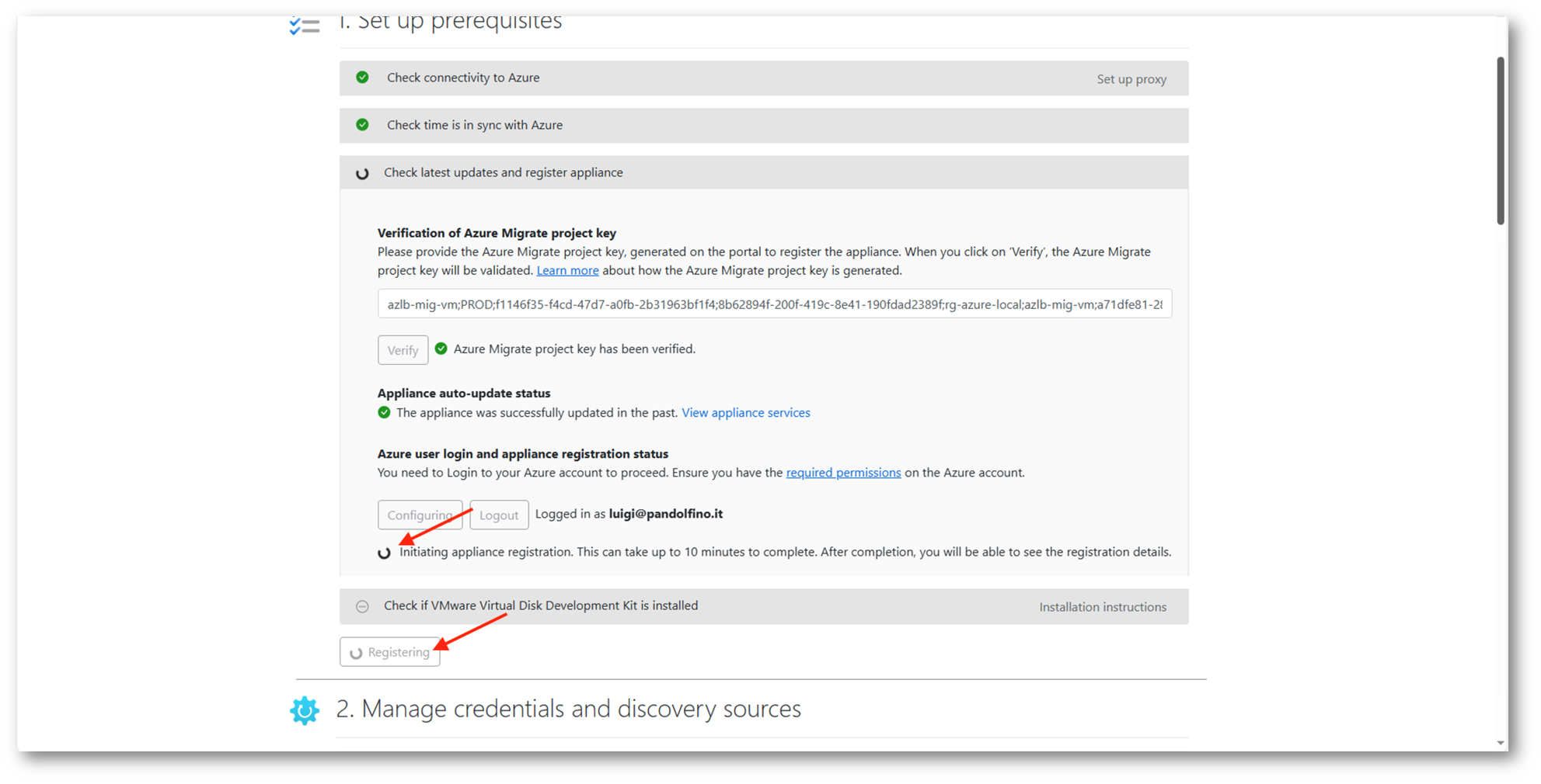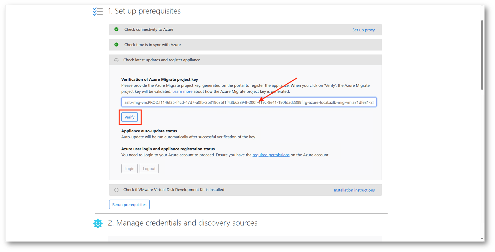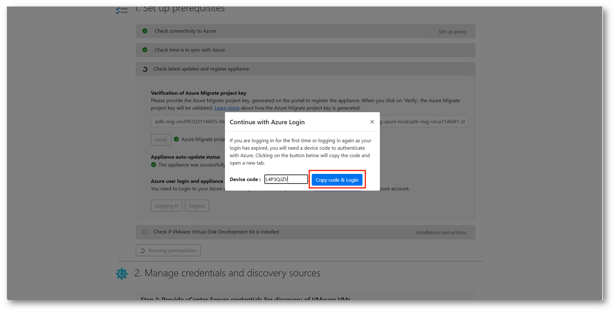 Come visto già in precedenza per l’appliance configurata in VMware, sarà necessario procedere alla verifica tramite la project key e al login con un l’Azure account preposto alla migrazione.
