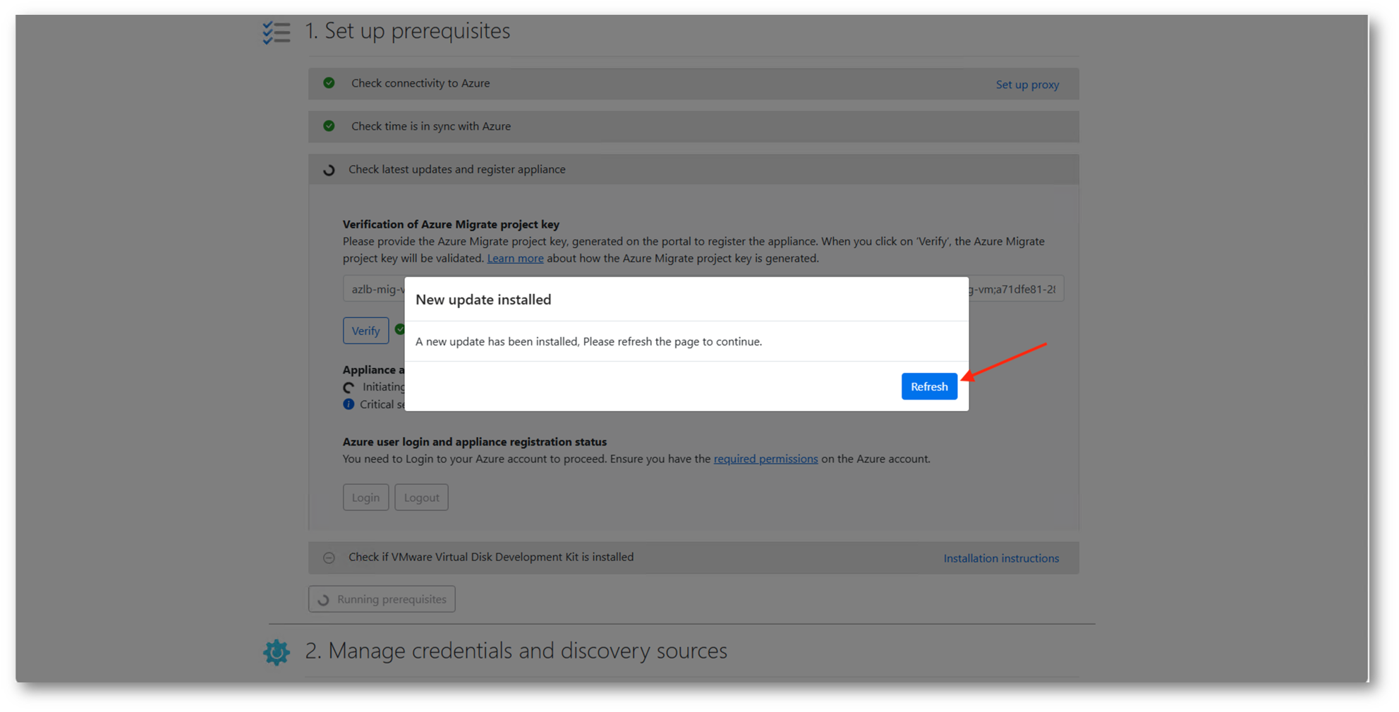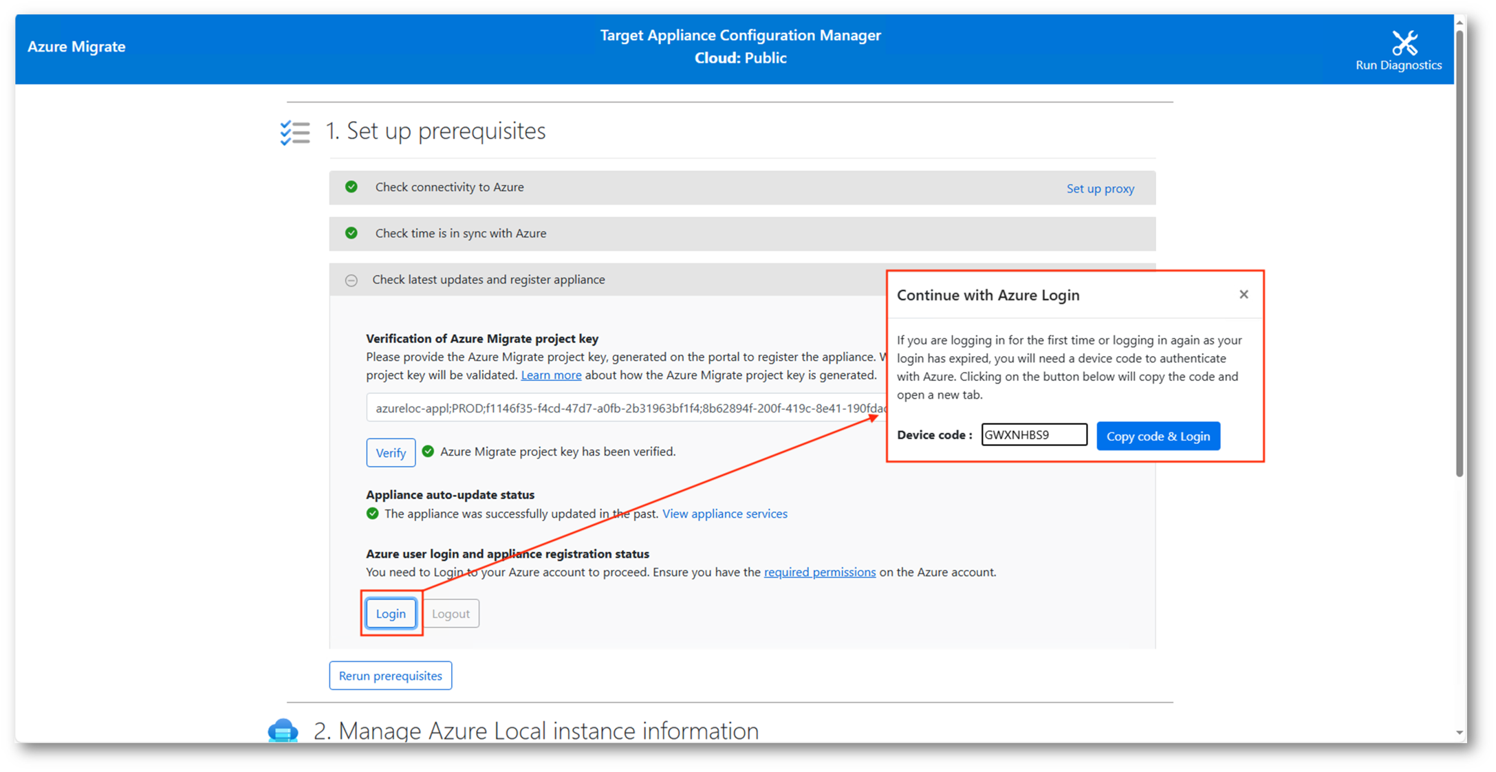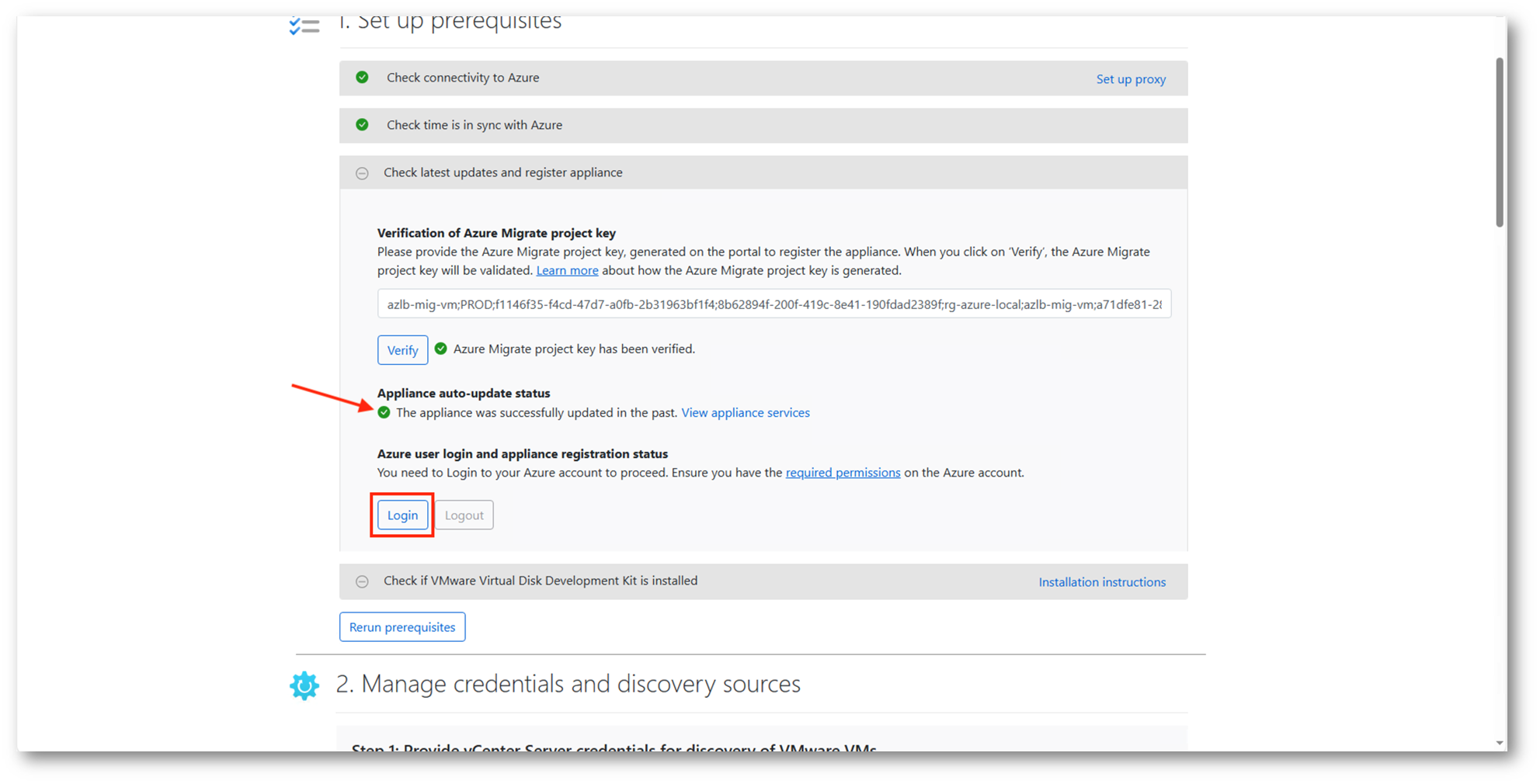 Come visto già in precedenza per l’appliance configurata in VMware, sarà necessario procedere alla verifica tramite la project key e al login con un l’Azure account preposto alla migrazione.