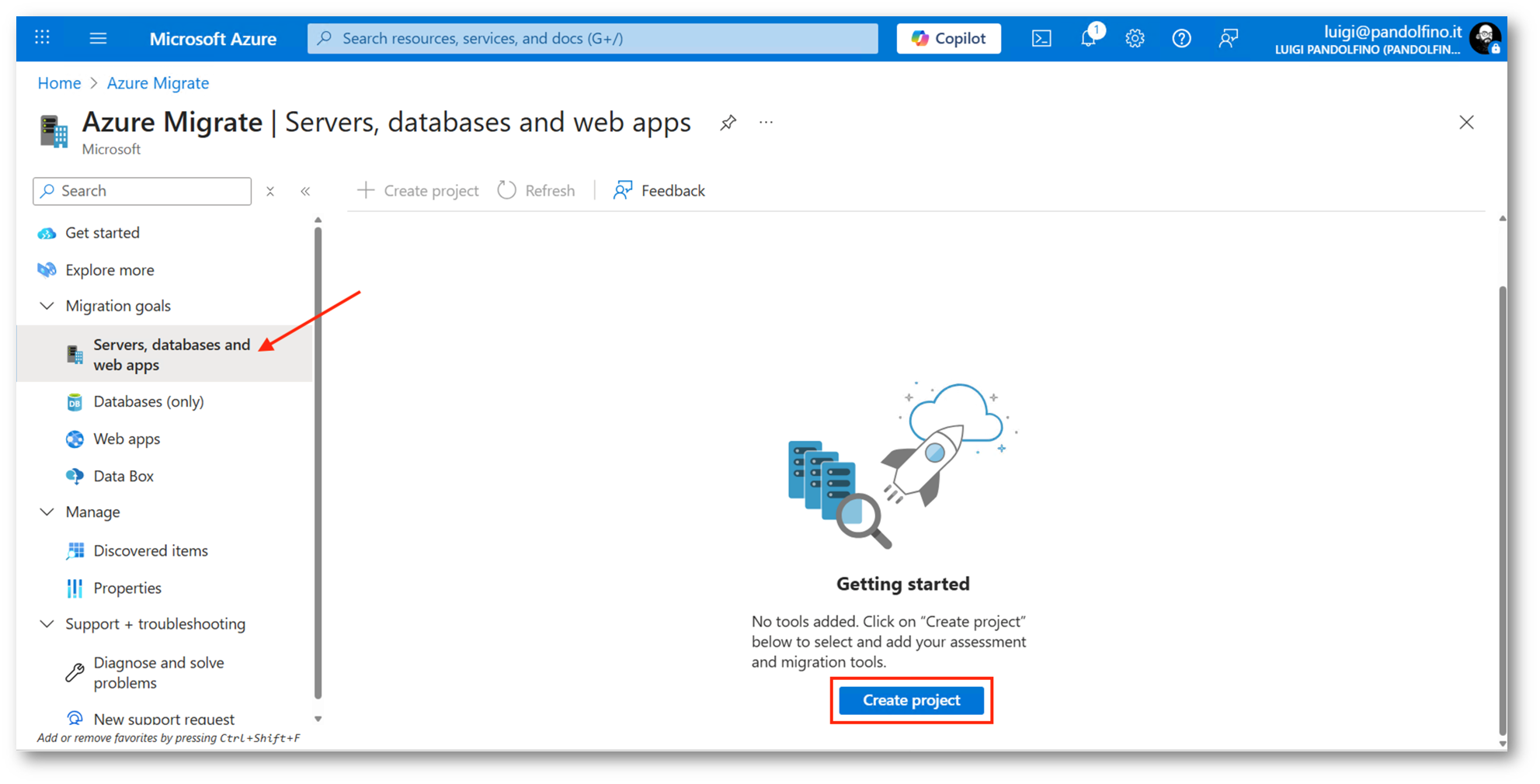 A seguire dovremo creare un nuovo Progetto di Migrazione, selezionando la voce Servers, databases and web apps. In questo modo otterremo una lista dei workload migrabili nella nuova infrastruttura.