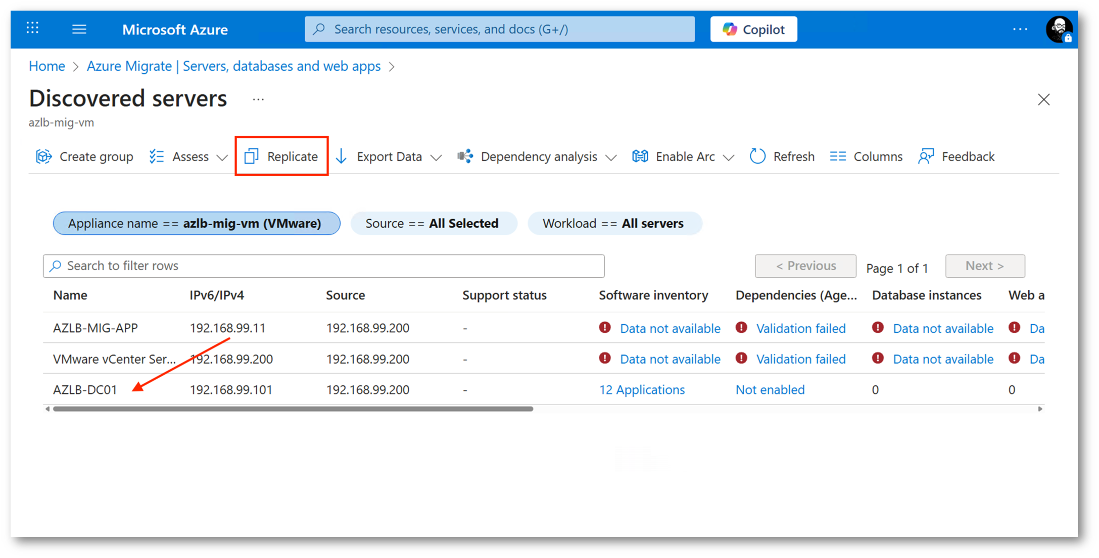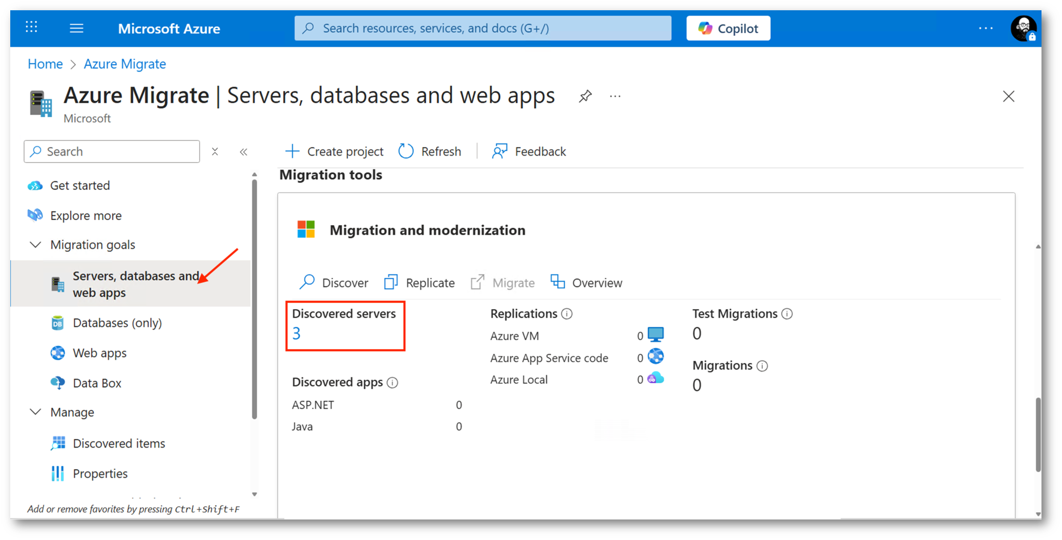 Possiamo ora tornare nel portale Azure, nella sezione “Migration and Modernization” di Azure Migrate, dove vedremo i “Discovered Servers“, nel mio caso 3. Cliccando proprio su questo numero accederemo all’area preposta alla gestione dei workload rilevati.