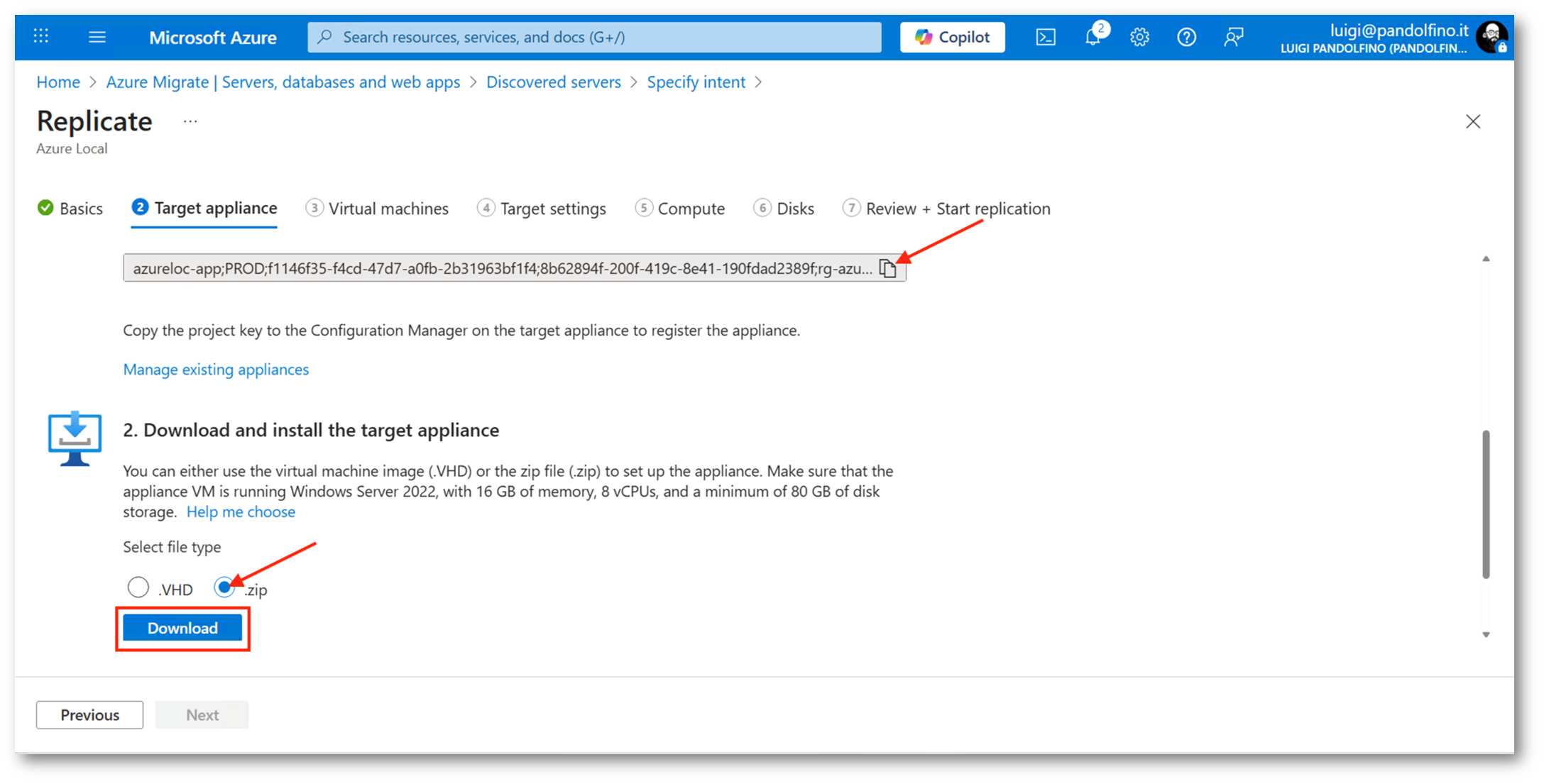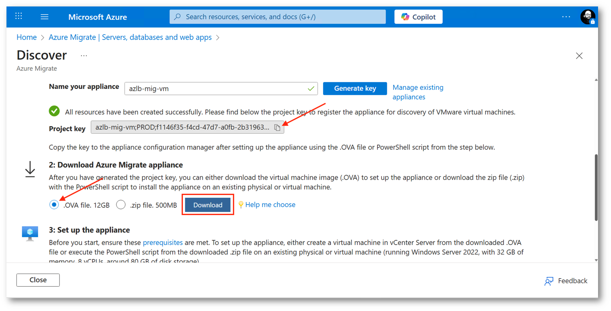 Dopo aver generato la chiave del progetto, è possibile scegliere tra due modalità di distribuzione dell’appliance di Azure Migrate: