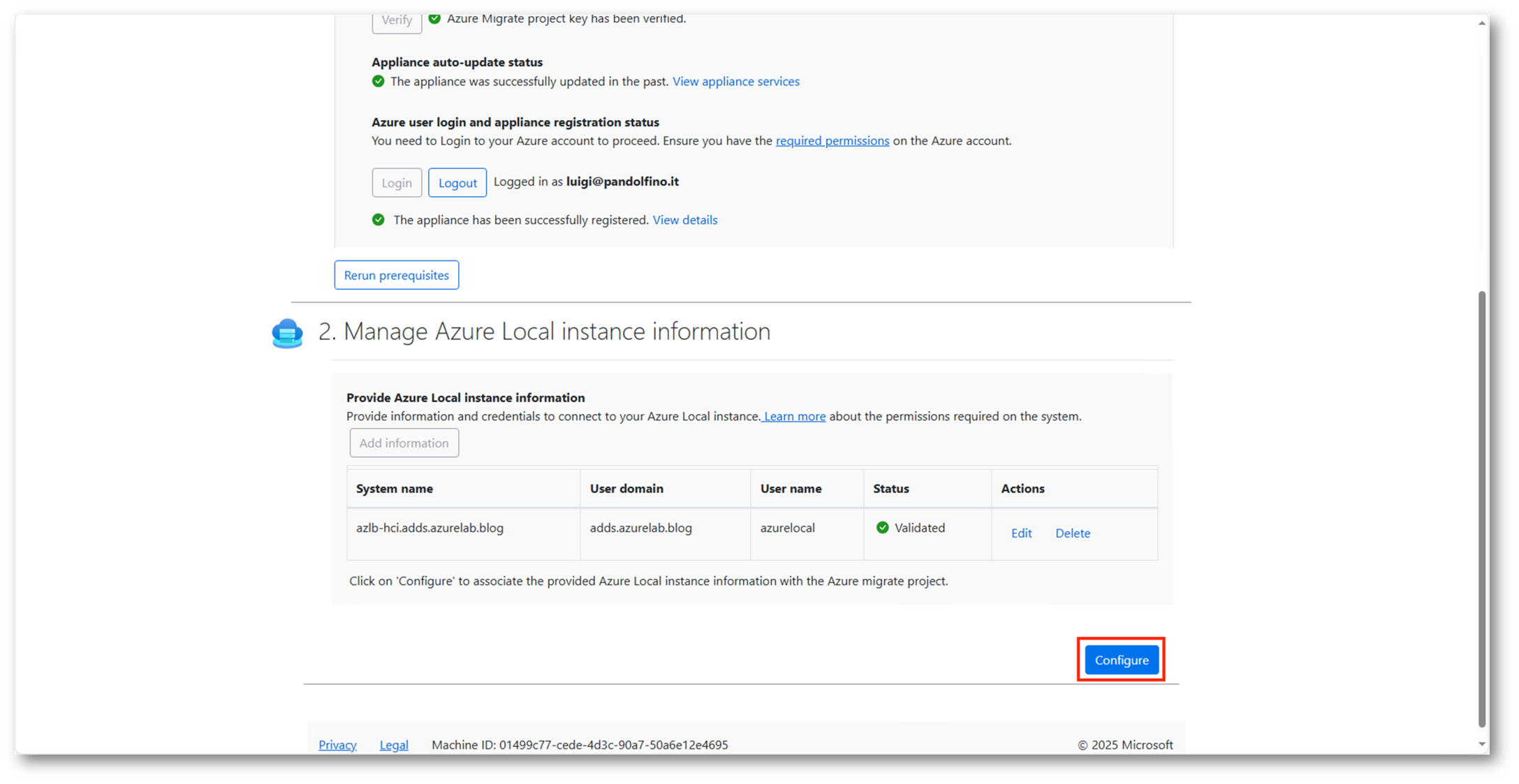 Se tutto risulterà corretto, eseguiremo il login con l’account Entra, così da registrare l’appliance nel progetto di migrazione.