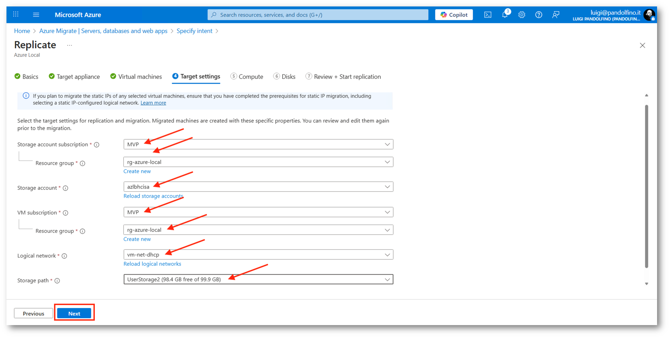 Ripartendo da dove avevamo lasciato nel portale Azure selezioniamo la target appliance appena configurata, successivamente le VM da migrare e inseriamo dati relativi a Subscription, Resource Group, Logical Interface e Storage Path di Azure Local.