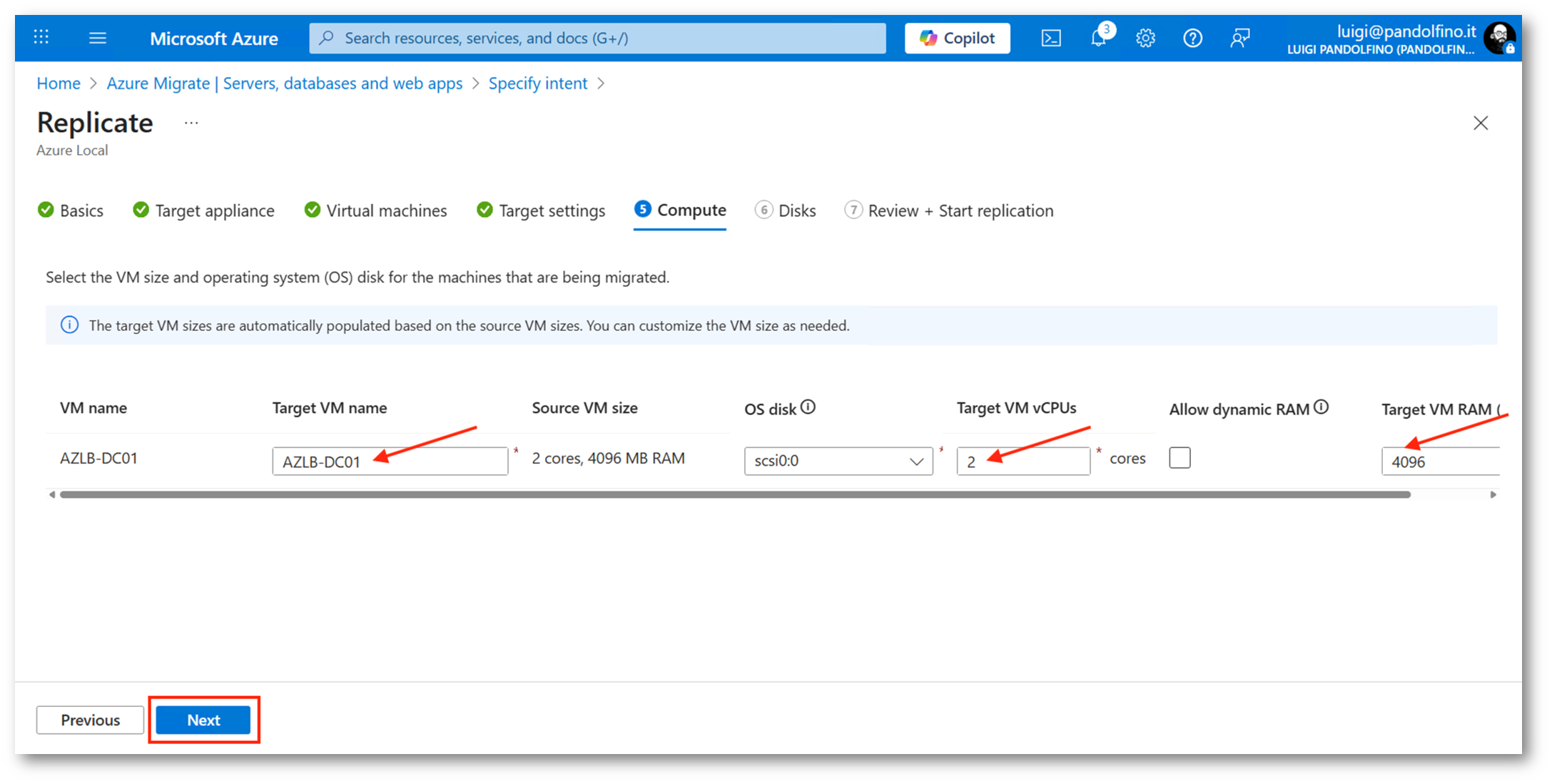 Saremo ora in grado di definire anche le caratteristiche della nuova virtual machine in termini di vCPU, memoria e tipologia disco. Il servizio suggerisce, comunque, un dimensionamento in linea con la sorgente.