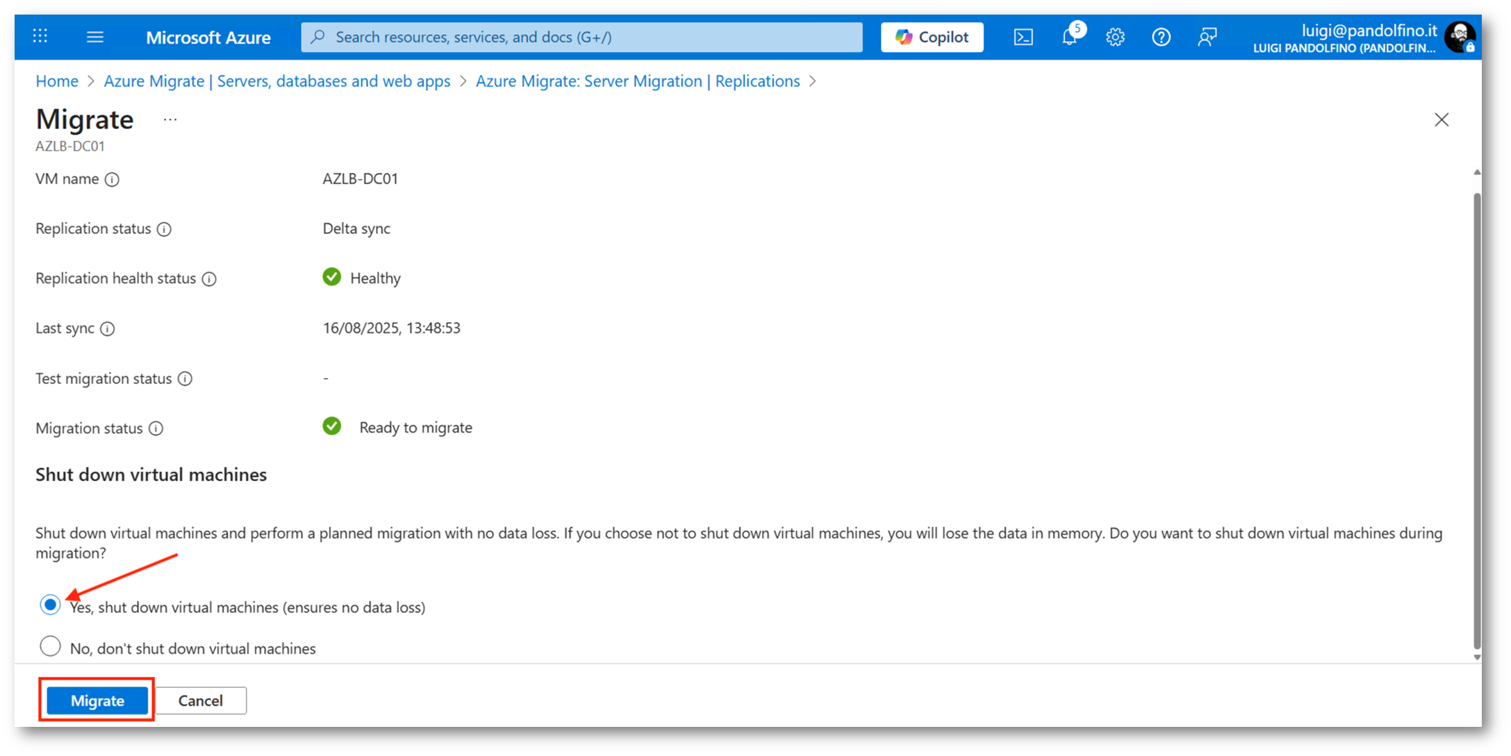 Come dicevamo, il processo di replica è continuo, nel momento in cui avvieremo la migrazione Azure Migrate eseguirà un ultimo sync, spegnerà la macchina di origine (volendo è possibile mantenerla accesa) e procederà all’attivazione nella nuova infrastruttura.