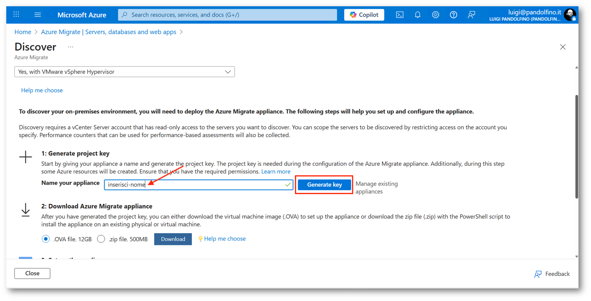 Il primo passaggio necessario è quello di creare la Azure Migrate Appliance, di fatto una macchina virtuale Windows all’interno dell’infrastruttura VMware che dovrà occuparsi del processo di Discovery dei workload presenti.