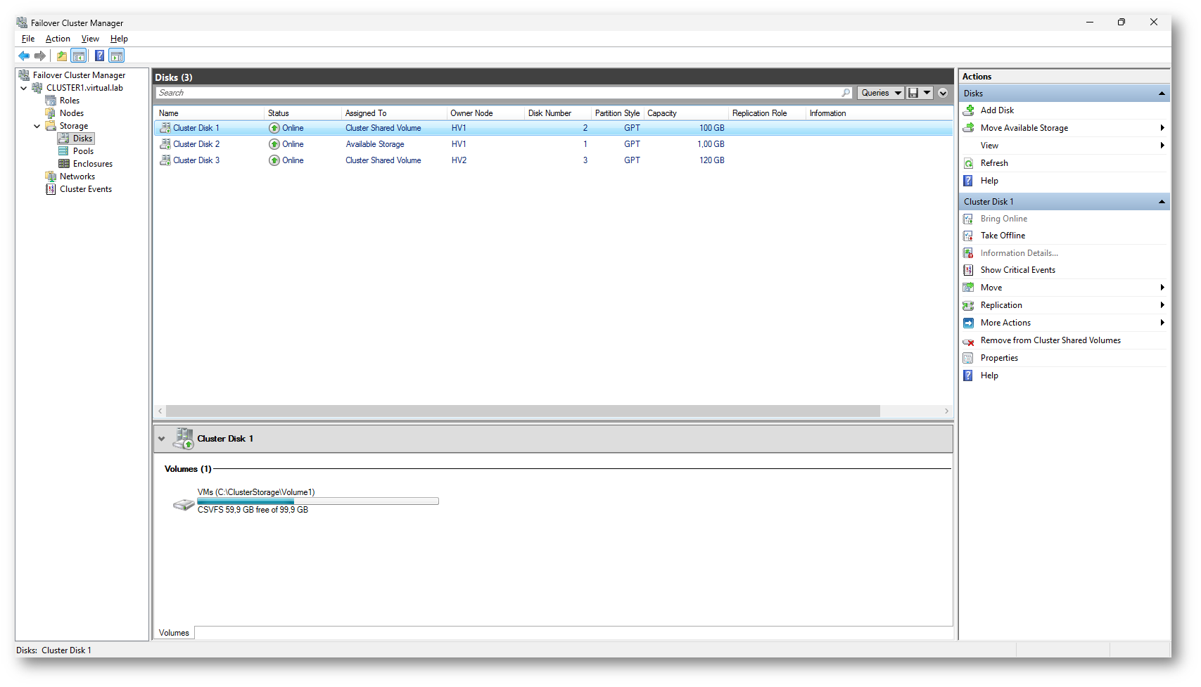 Figura 1: Failover Cluster Manager – Visualizzazione dei dischi del cluster, con volumi configurati come Cluster Shared Volume
