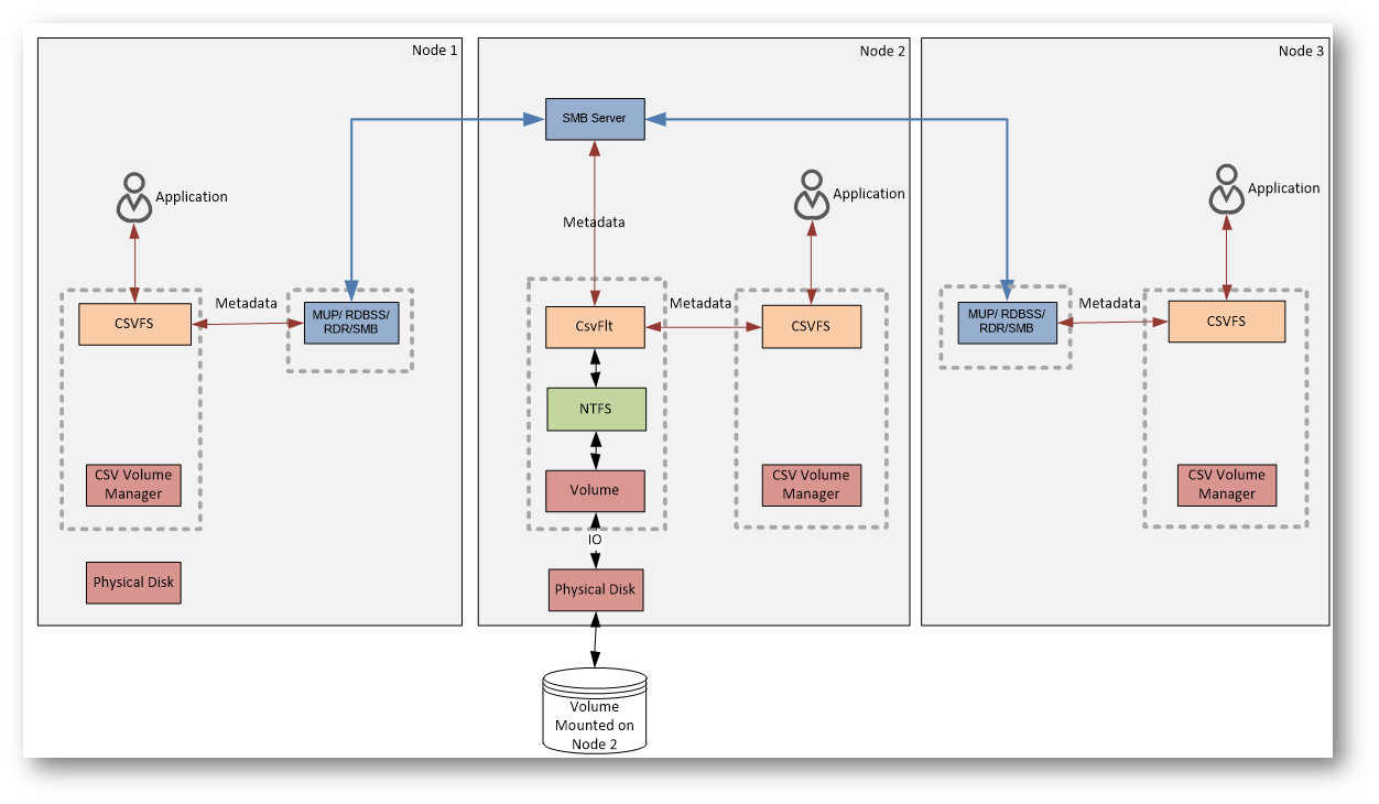 Qui di seguito vi mostro un diagramma che mostra i componenti del CSV ed il modo in cui i dati vengono gestiti nel cluster. L’idea chiave del diagramma è questa: