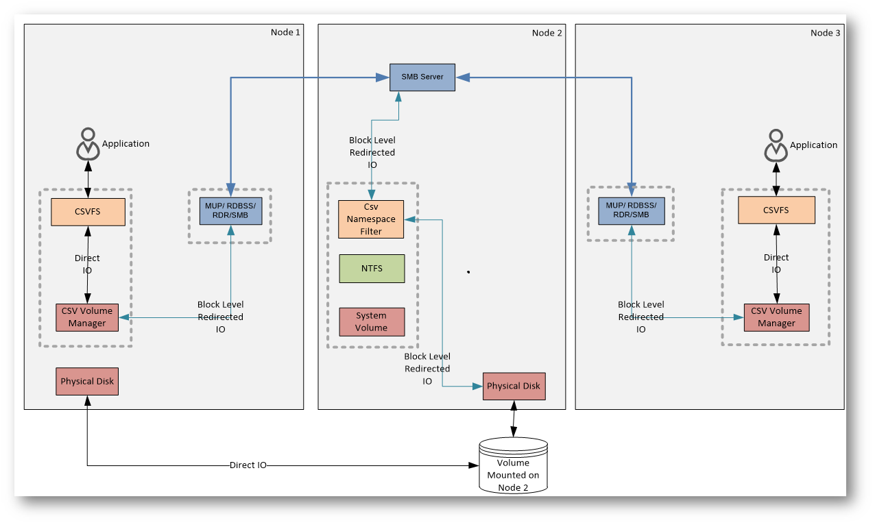 Nel Block Level Redirected I/O lo stack CSV e quello NTFS del coordinatore non vengono utilizzati. Questo perché l’I/O a livello di blocco bypassa completamente il file system e lo stack del volume, andando direttamente al disco, in modo analogo al Direct I/O.