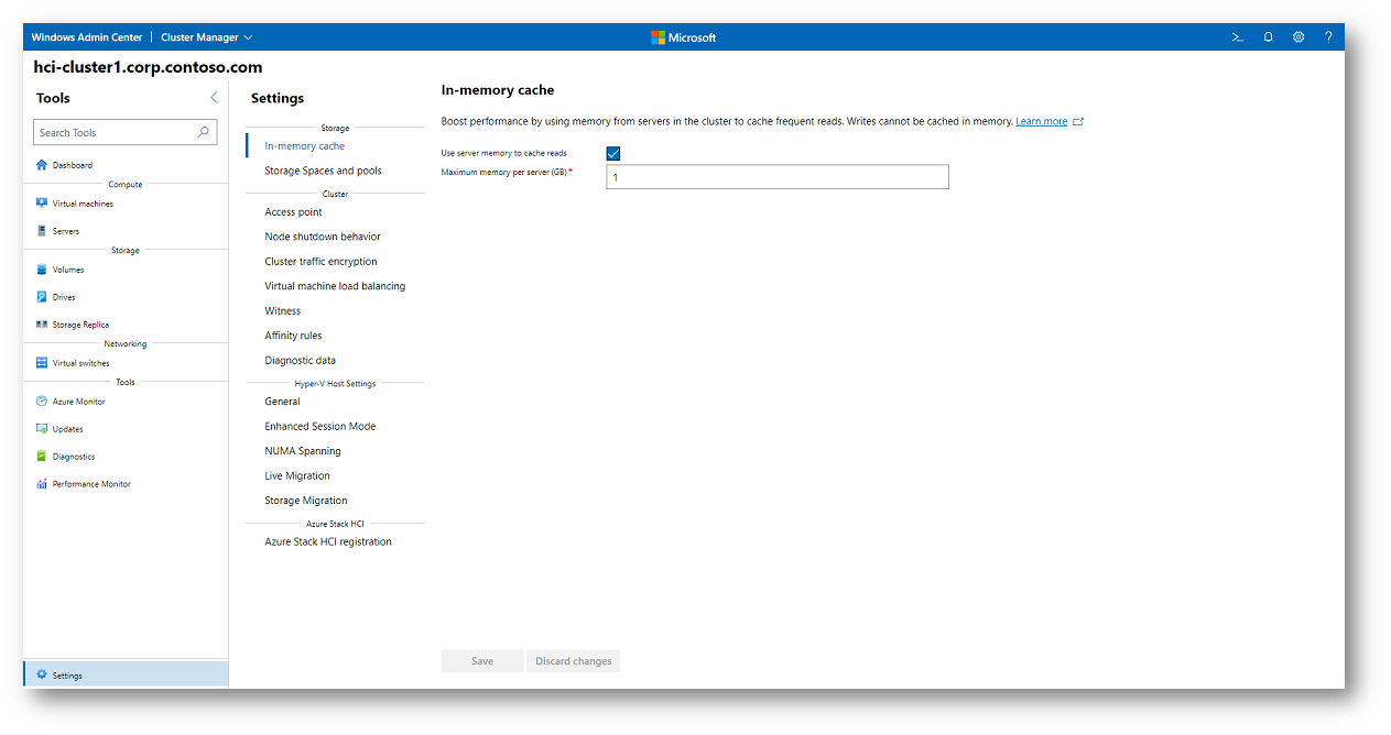 Per implementare la CSV Cache tramite Windows Admin Center, collegatevi innanzitutto al cluster e aprite la sezione Settings dal pannello degli strumenti. All’interno delle impostazioni di Storage trovate la voce dedicata alla In-memory cache, da cui potete abilitare la funzionalità e definire la quantità massima di memoria da riservare alla cache. Una volta applicate le modifiche, la configurazione viene distribuita automaticamente su tutti i nodi del cluster.