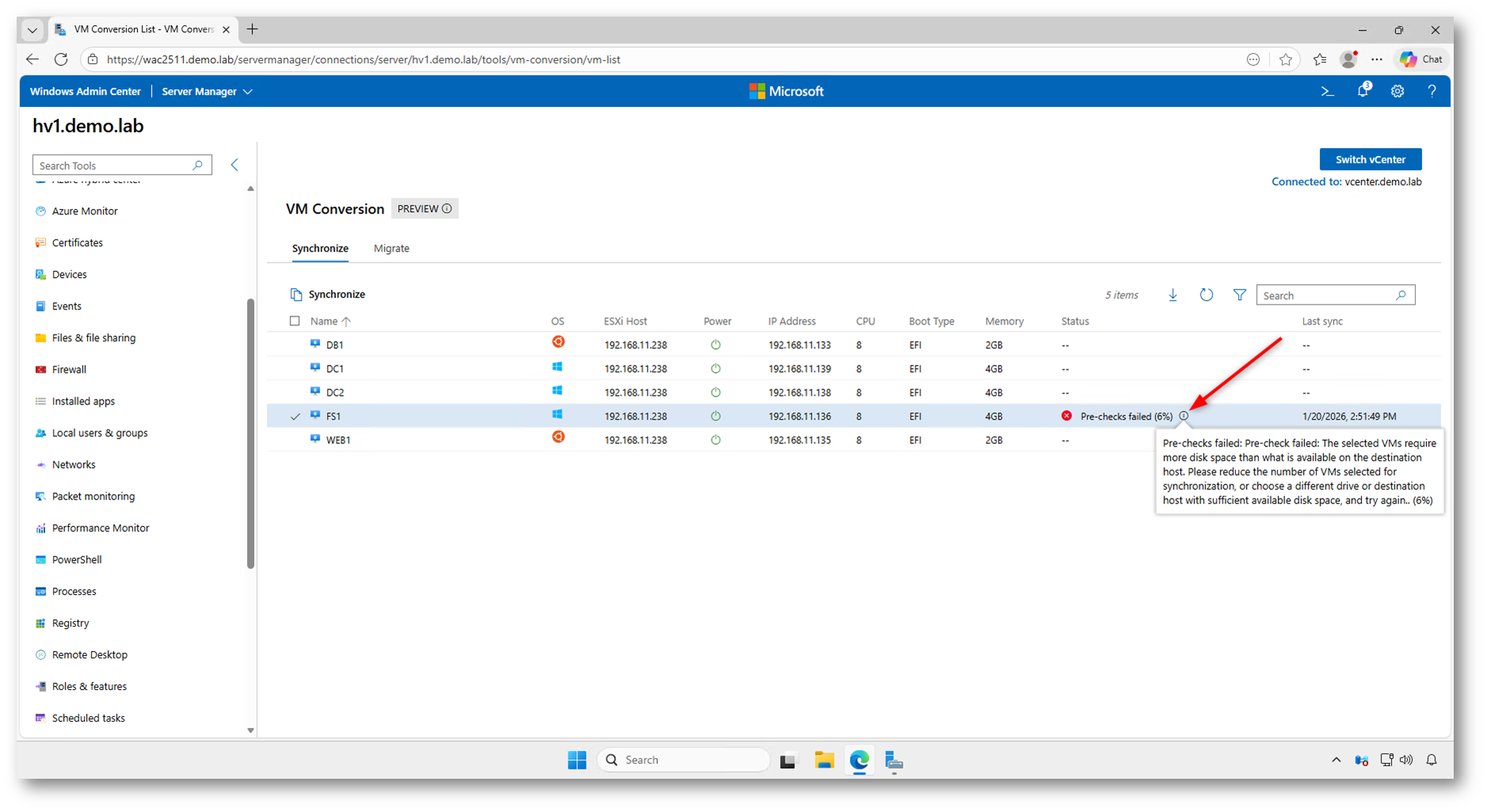 Nel caso in cui vengano rilevati problemi durante i controlli preliminari, Windows Admin Center segnala immediatamente la criticità direttamente nell’elenco delle macchine virtuali. La sincronizzazione viene interrotta e lo stato viene aggiornato con l’indicazione dell’errore riscontrato.