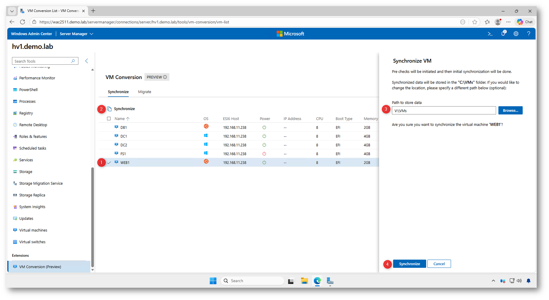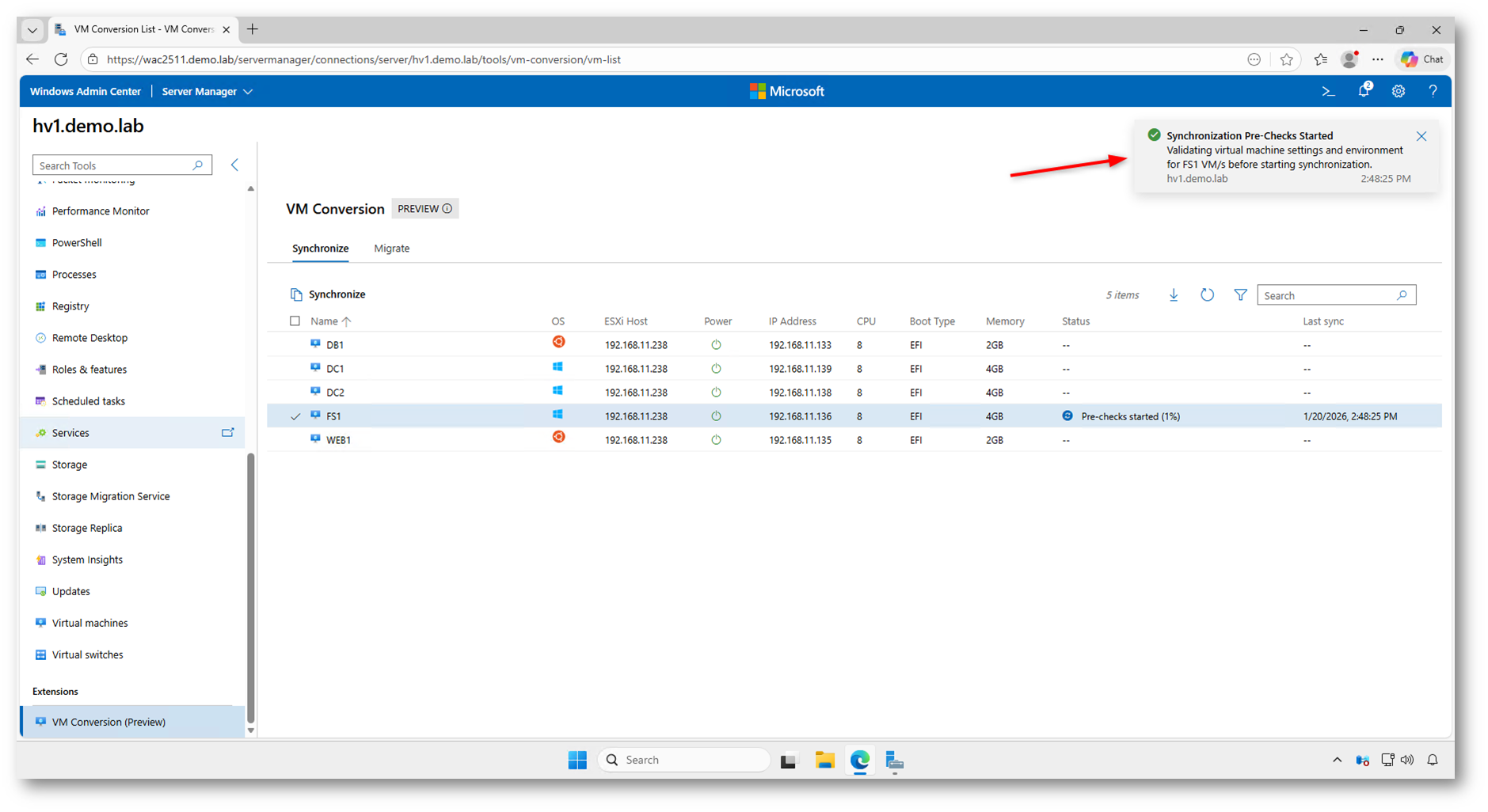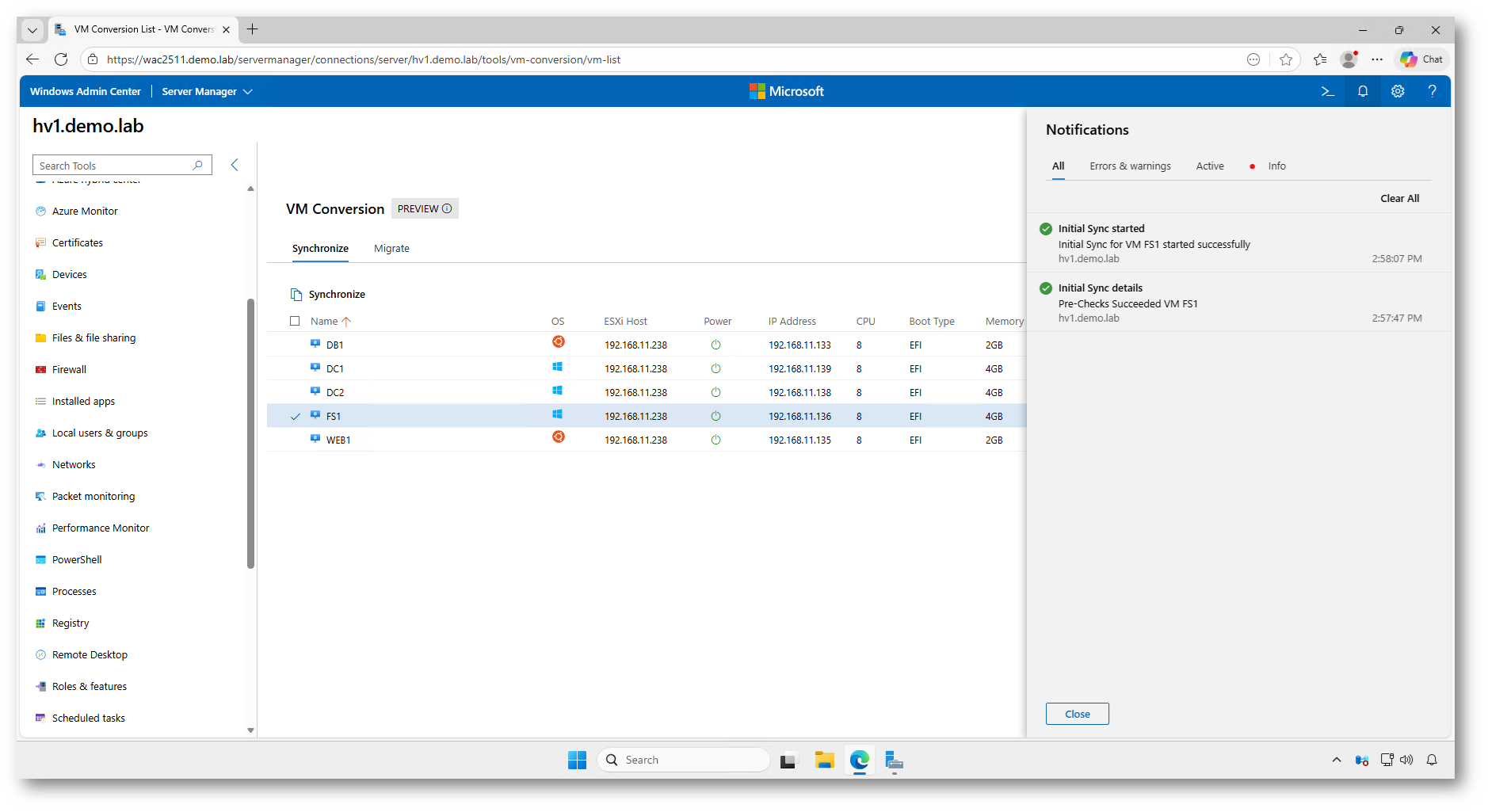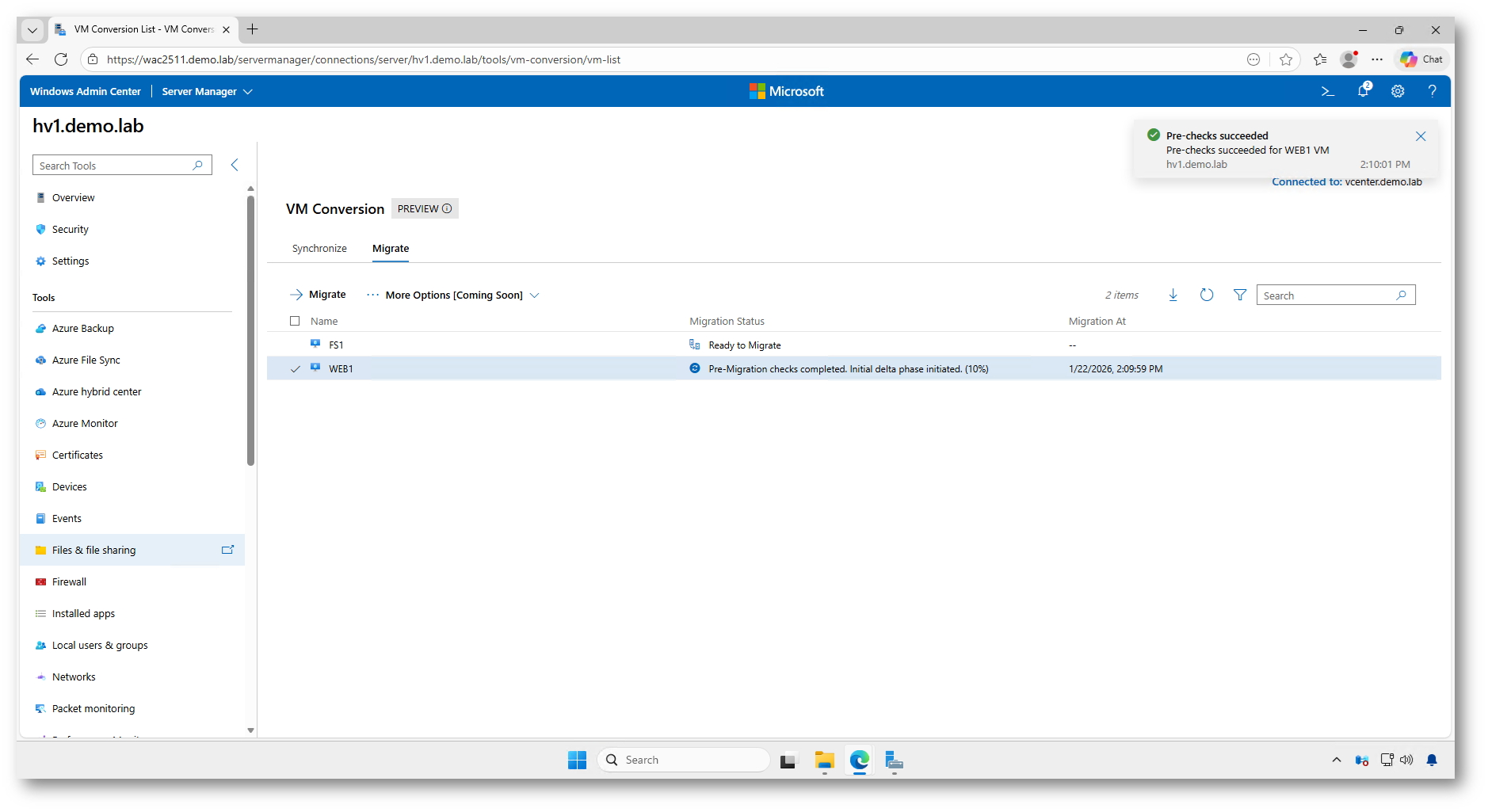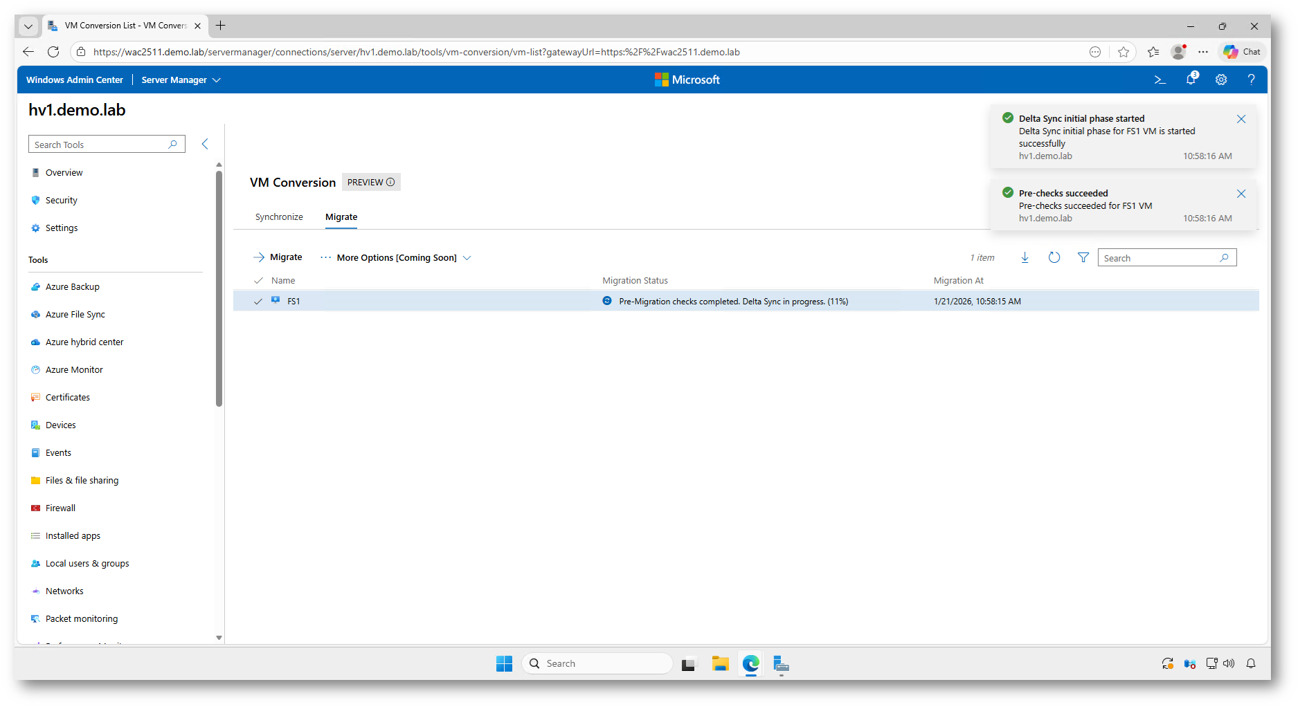 Una volta confermata l’operazione, Windows Admin Center avvia automaticamente una serie di operazioni sequenziali: vengono eseguiti i controlli preliminari, preparato l’ambiente di destinazione, creato uno snapshot della macchina virtuale sorgente e infine completata la sincronizzazione dei dischi.