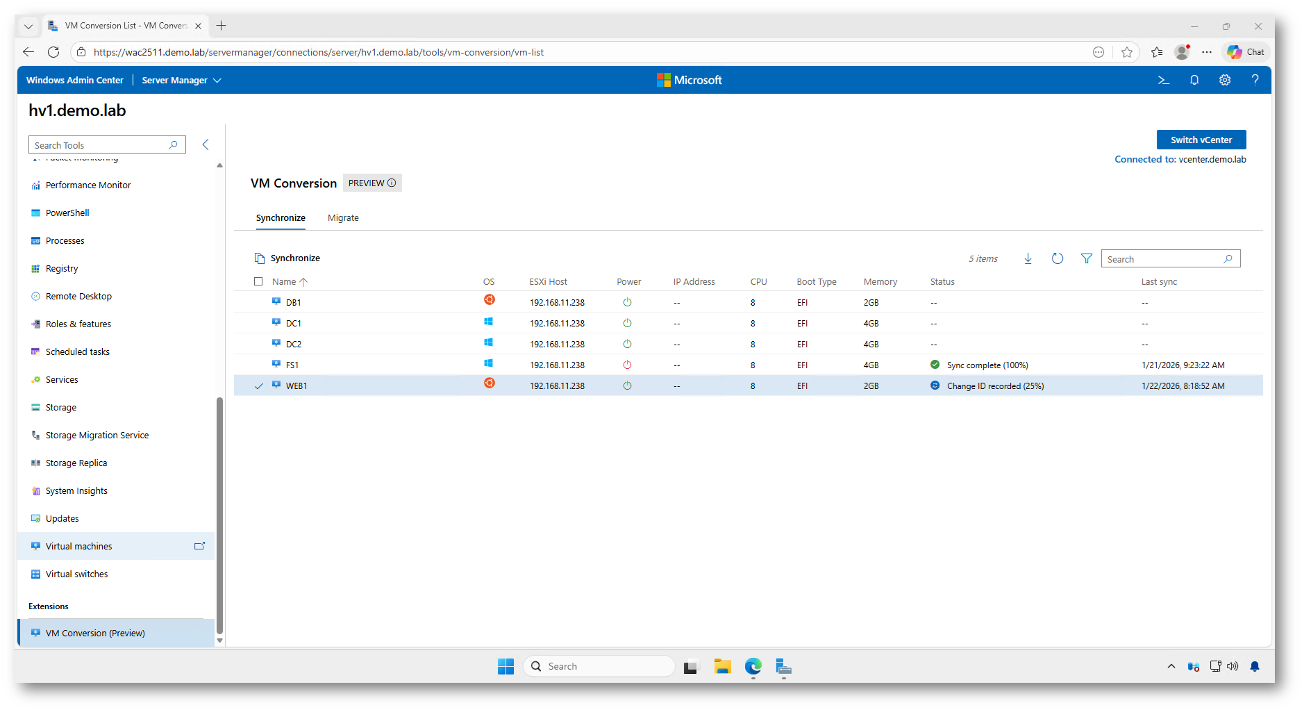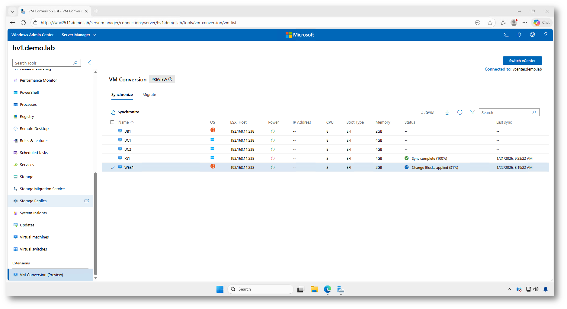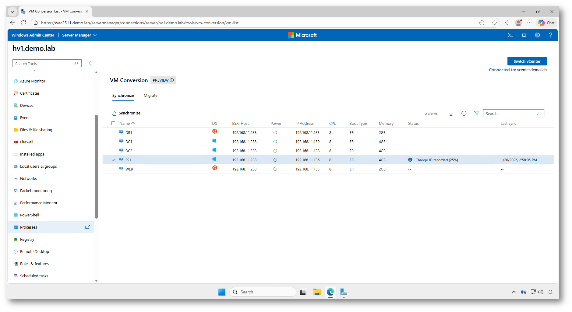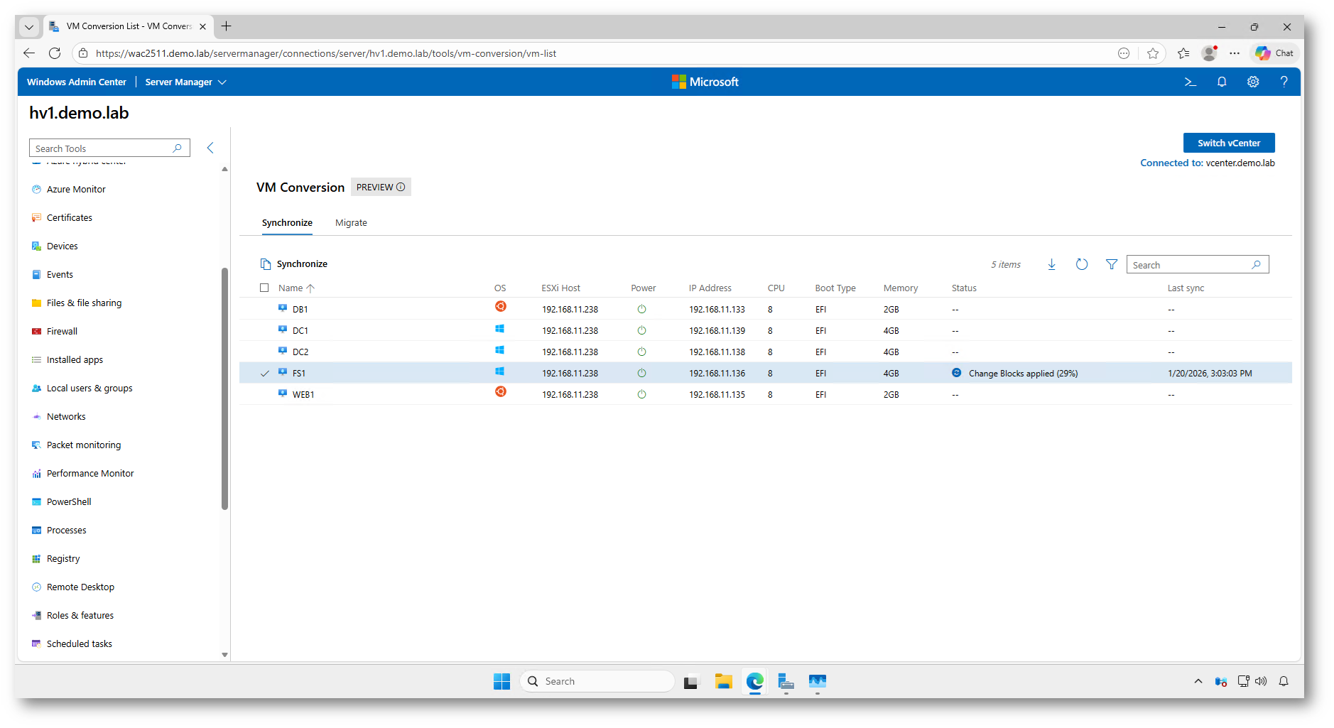 Al termine della sincronizzazione, il processo gestito da Windows Admin Center provvede automaticamente alla rimozione degli snapshot creati in precedenza sull’infrastruttura VMware vCenter.