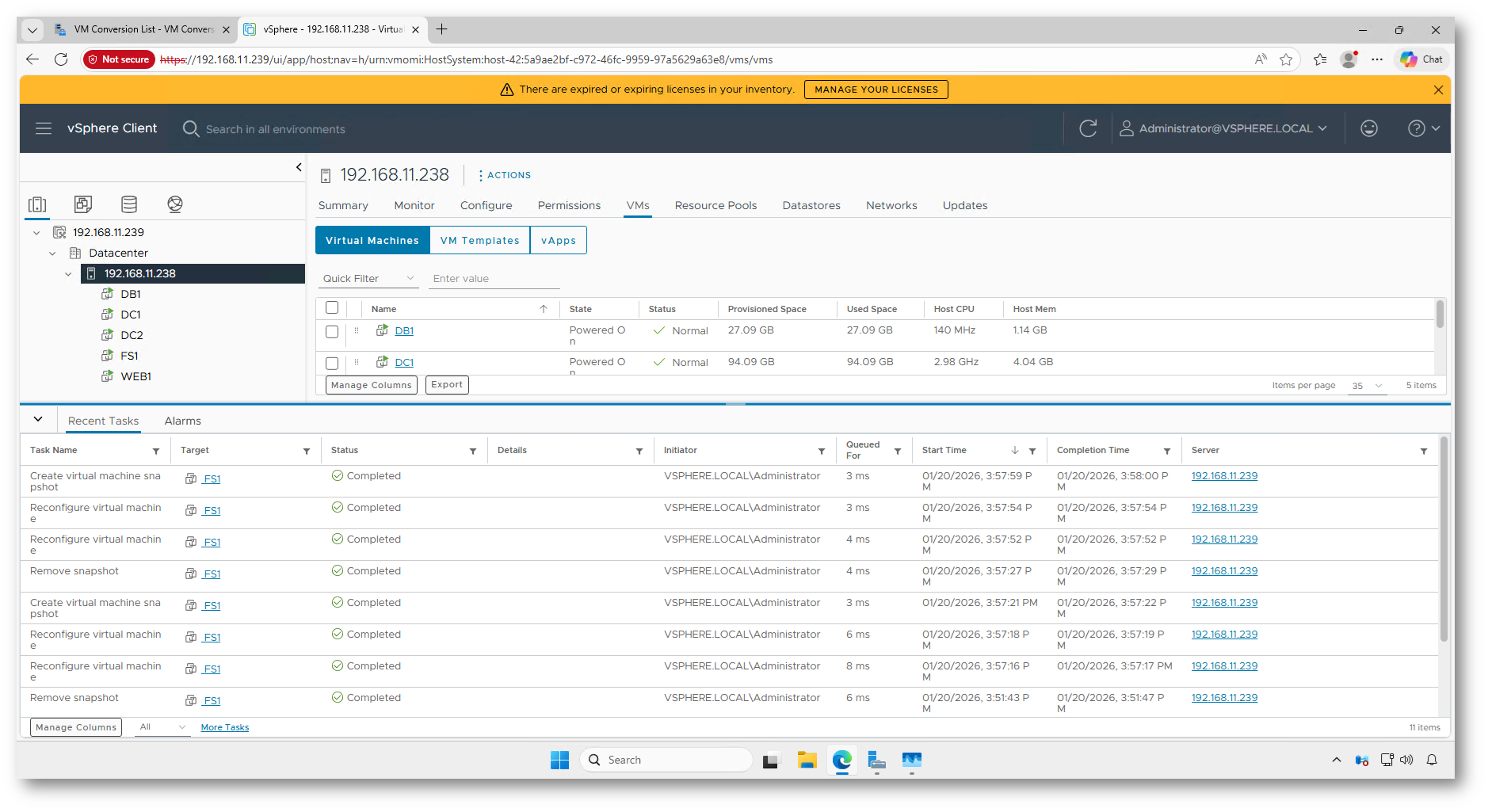 Figura 20: Task Console di VMware vCenter: operazioni automatiche eseguite sulla macchina virtuale durante la migrazione verso Hyper-V
